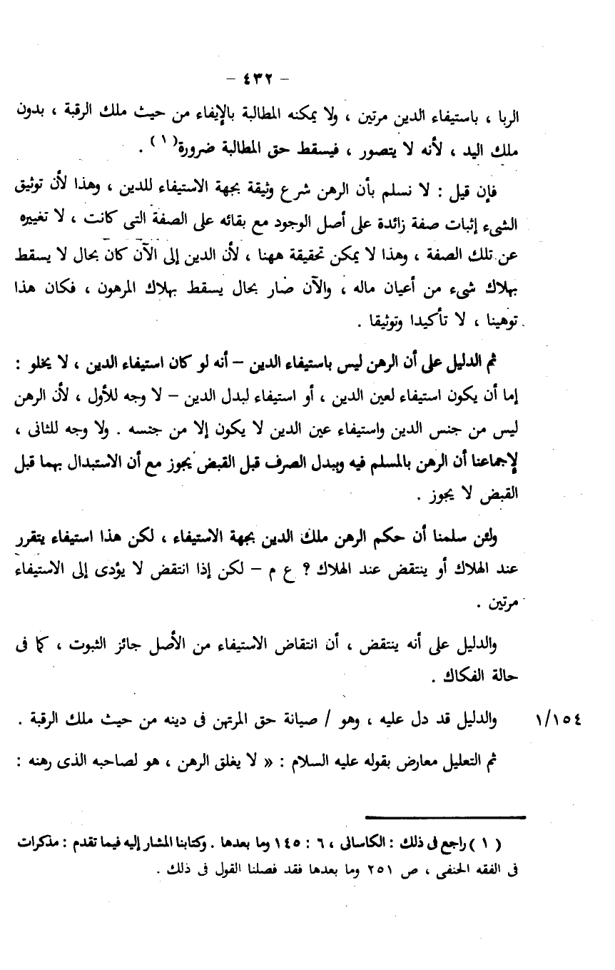 ولئن سلمنا أن حكم الرهن ملك الدين بجهة الاستيفاء، لكن هذا استيفاء يتقرر عند الهلاك أو ينتقض عند الهلاك؟ ع م- لكن إذا انتقض لا يؤدى إلى الاستيفاء مرتين.
