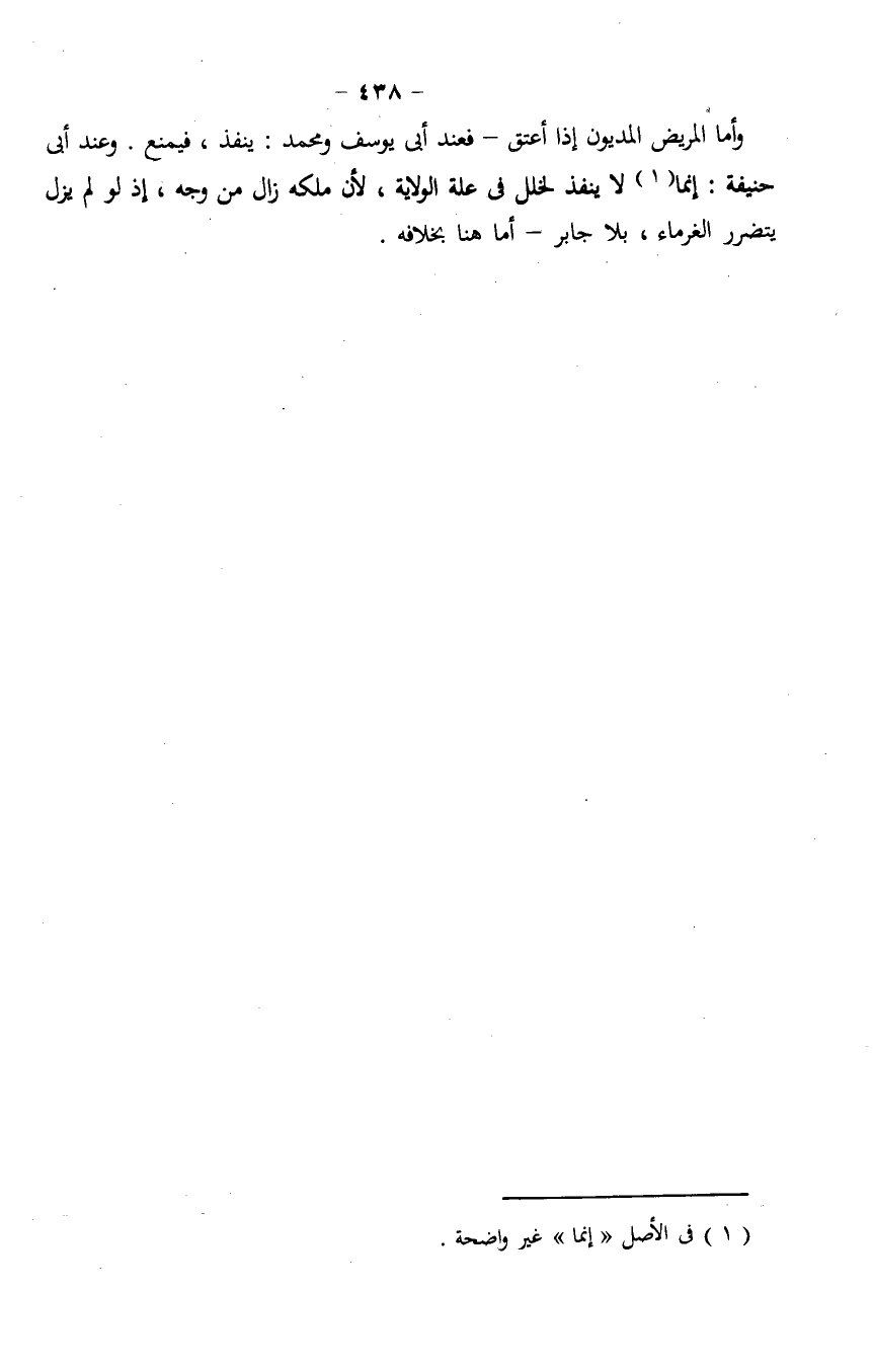 وأما المريض المديون إذا أعتق- فعند أبى يوسف ومحمد: ينفذ، فيمنع. وعند أبى حنيفة: إنما لا ينفذ لخلل في علة الولاية، لأن ملكه زال من وجه، إذ لو لم يزل يتضرر الغرماء، بلا جابر- أما هنا بخلافه.