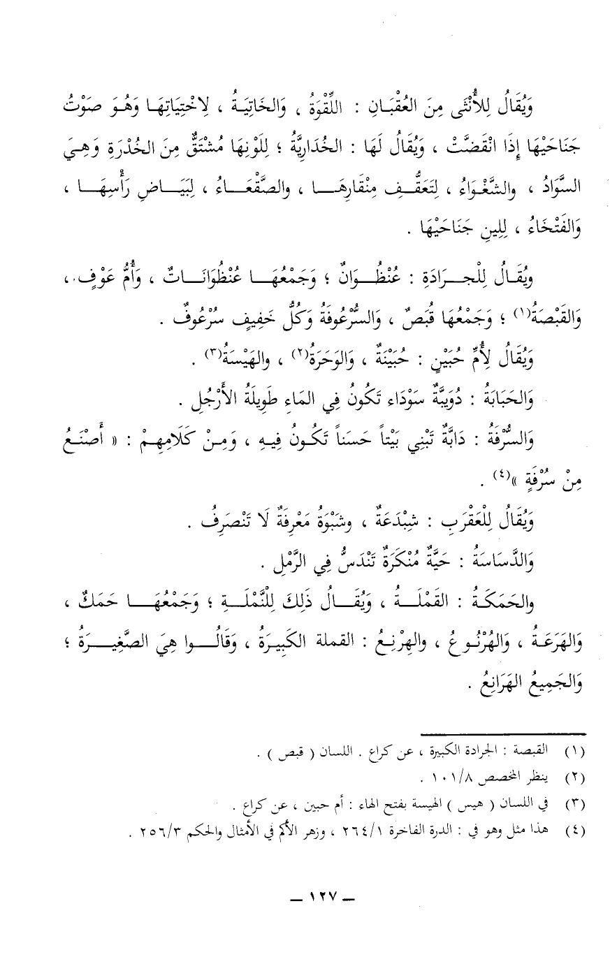 ويقال لِلْجرَادَةِ: عُنْظُوَانٌ؛ وجمعها عُنْظُوَانَاتٌ، وأم عَوْفٍ، والقَبْصَةُ؛ وجمعها قُبَصٌ، والسُّرْعُوفَةُ وكل خفيف سُرْعُوفٌ.