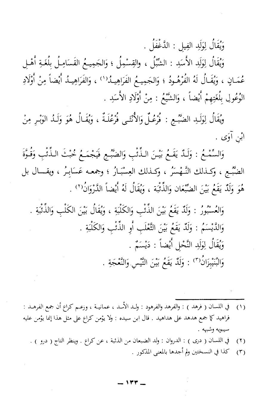 ويقال لولد الأسد: الشِّبْلُ، والقِسْمِلُ؛ والجميع القَسَامِلُ بلغة أهل عُمَان، ويقال له الفُرْهُودُ؛ والجميع الفَرَاهِيدُ، والفَرَاهِيدُ أيضا من أولاد الوُعُولِ بلغتهم أيضًا، والشَّيْعُ: من أولاد الأسد.