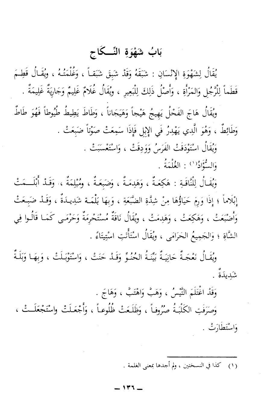 ويقال للناقة: هَكِعَةٌ، وهَدِمَةٌ، وضَبِعَةٌ، ومُبْلِمَةٌ، وقد أَبْلَمَتْ إِبْلَامًا، إذا وَرِمَ حياؤها من شدة الضَّبَعَةِ، وبها بَلْمَة شديدة، وقد ضبعت وأضبعت، وهَكِعَتْ، وهَدِمَتْ، ويقال ناقة مُسْتَحْرِمَةٌ وحَرْمَى، كما قالوا في الشاة؛ والجميع الحَرَامَى، ويقال اسْتَاتَتِ اسْتِيتَاءً.