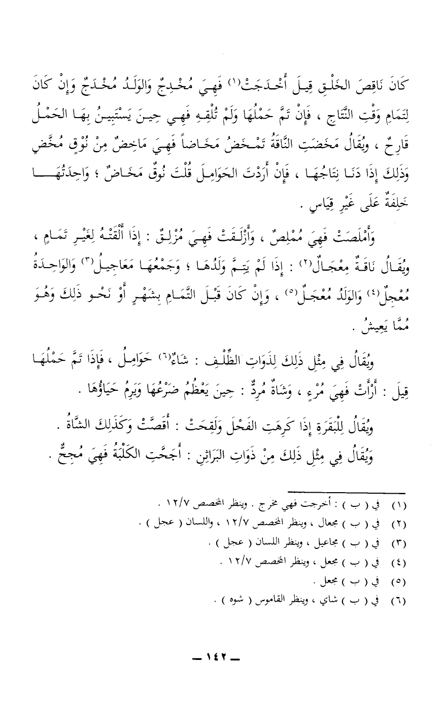 كان ناقص الخلق؛ قيل: أَخْدَجَتْ فهي مُخْدِجٌ والولد مُخْدَجٌ وإن كان لتمام وقت النَّتَاجِ، فإن تَمَّ حملها ولم تُلْقِهِ فهي حين يستبين بها الحمل قَارِحٌ، ويقال: مخضت الناقة تَمْخَضُ مَخَاضًا فهي مَاخِضٌ من نُوقٍ مُخَّضٍ وذلك إذا دَنَا نتاجها، فإن أردت الحوامل قلت نوق مَخَاضٌ؛ واحدتها خَلِفَةٌ على غير قياس.