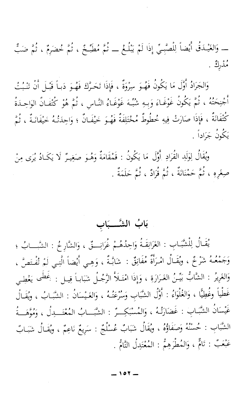 والجَرَادُ أول ما يكون فهو سِرْوَةٌ، فإذا تَحَرَّكَ فهو دَبًا قبل أن تَنْبُتُ أجنحته، ثم يكون غَوْغَاءَ وبه شُبِّهَ غوغاء الناس، ثم هو كُتْفَانٌ الوَاحِدَةُ كُتْفَانَةٌ، فإذا صارت فيه خطوط مختلفة فهو خَيْفَانٌ؛ واحدته خَيْفَانَةٌ، ثم يكون جرادًا.