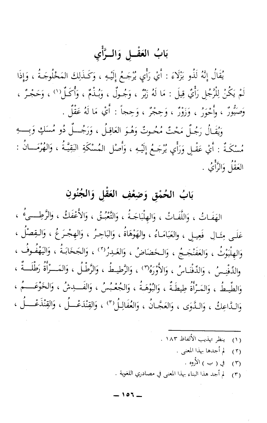يقال إنه لذو بَزْلَاء: أي رأي يرجع إليه، وكذلك المَخْلُوجَةُ، وإذا لم يكن للرجل رأي قيل: ما له زَبْرٌ، وَجُولٌ، وبُذْمٌ، وأُكَلٌ، وحَجْرٌ، وصَيُّورٌ، وأَحْوَرُ، وزَوْرٌ، وحِجْرٌ، وحِجًا: أي ما له عقل.