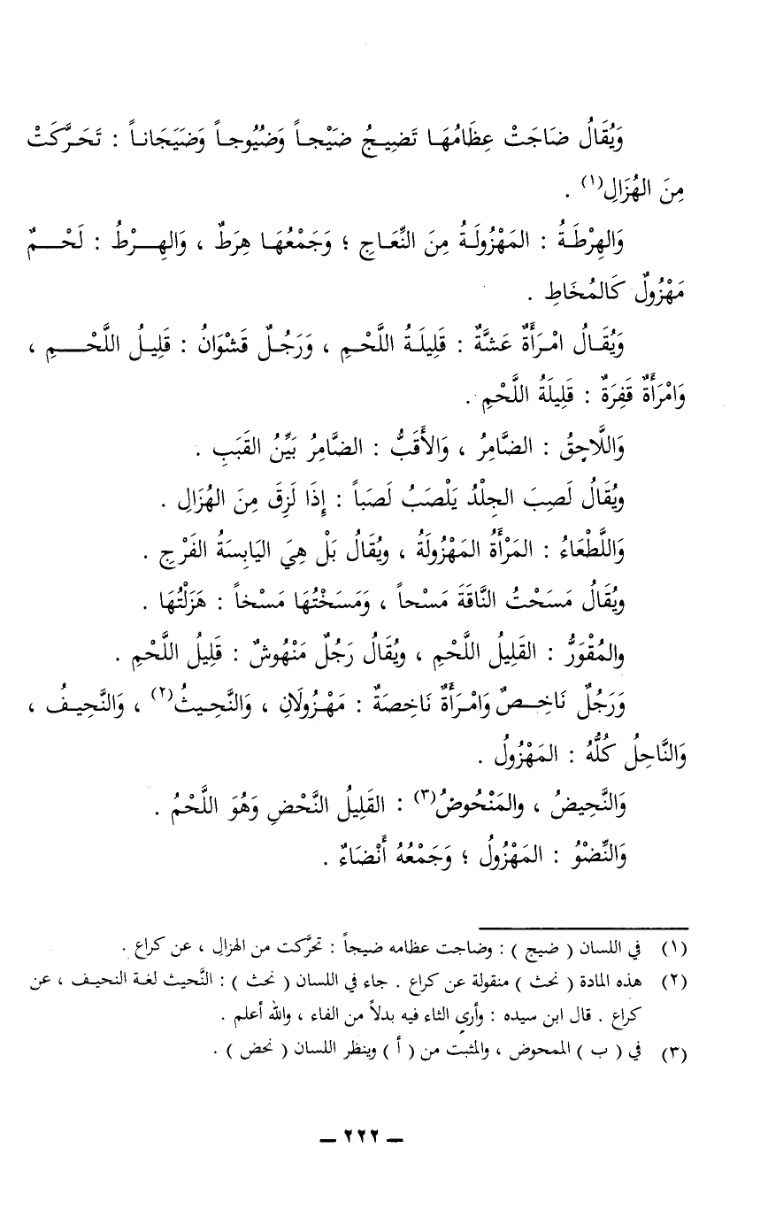 ويُقَالُ امرأة عَشَّةٌ: قَلِيلَةُ اللحم، ورَجُلٌ قَشْوَانُ: قليل اللحم، وامرأة قَفِرَةٌ: قليلة اللحم.