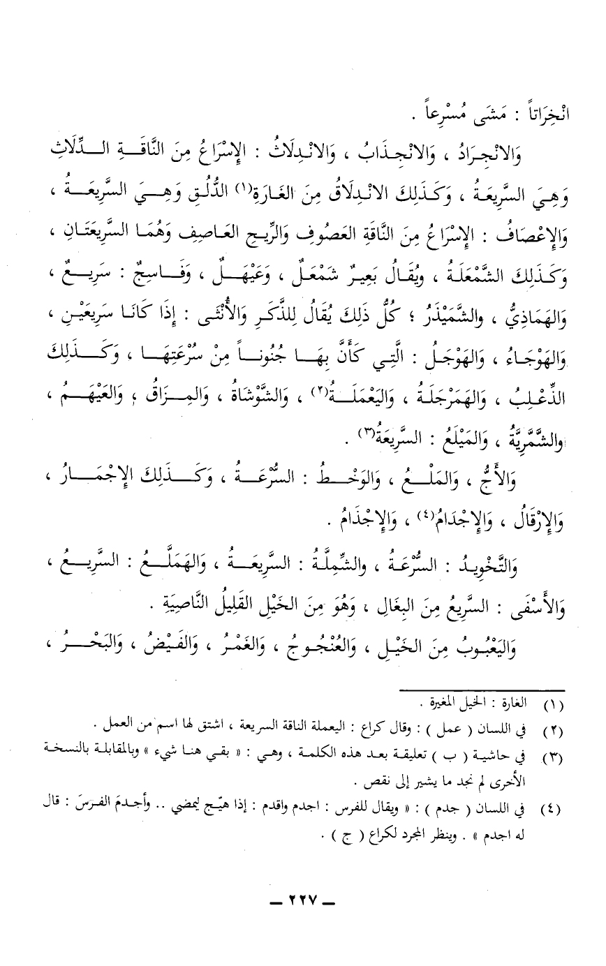 والانْجِرَادُ، والانْجِذَابُ، والانْدِلَاثُ: الإِسْرَاعُ من الناقة الدِّلَاثِ وهي السريعة، وكذلك الانْدِلَاقُ من الغَارَةِ الدُّلُقِ وهي السريعة، والإِعْصَافُ: الإِسْرَاعُ من الناقة العَصُوفِ والرِّيحِ العَاصِفِ وَهُمَا السريعتان، وكذلك الشَّمْعَلَةُ، ويقال بعير شَمْعَلٌ، وعَيْهَلٌ، وفَاسِجٌ: سَرِيعٌ، والهَمَاذِيُّ، والشَّمَيْذَرُ، كل ذلك يقال للذَّكَرِ والأنثى: إذا كانا سريعين، والهَوْجَاءُ، والهَوْجَلُ: التي كأن بها جُنُونًا من سرعتها، وكذلك الذِّعْلِبُ، والهَمَرْجَلَةُ، واليَعْمَلَةُ، والشَّوْشَاةُ، والمِزَاقُ، والعَيْهَمُ، والشَّمَّرِيَّةُ، والمَيْلَعُ: السريعة.