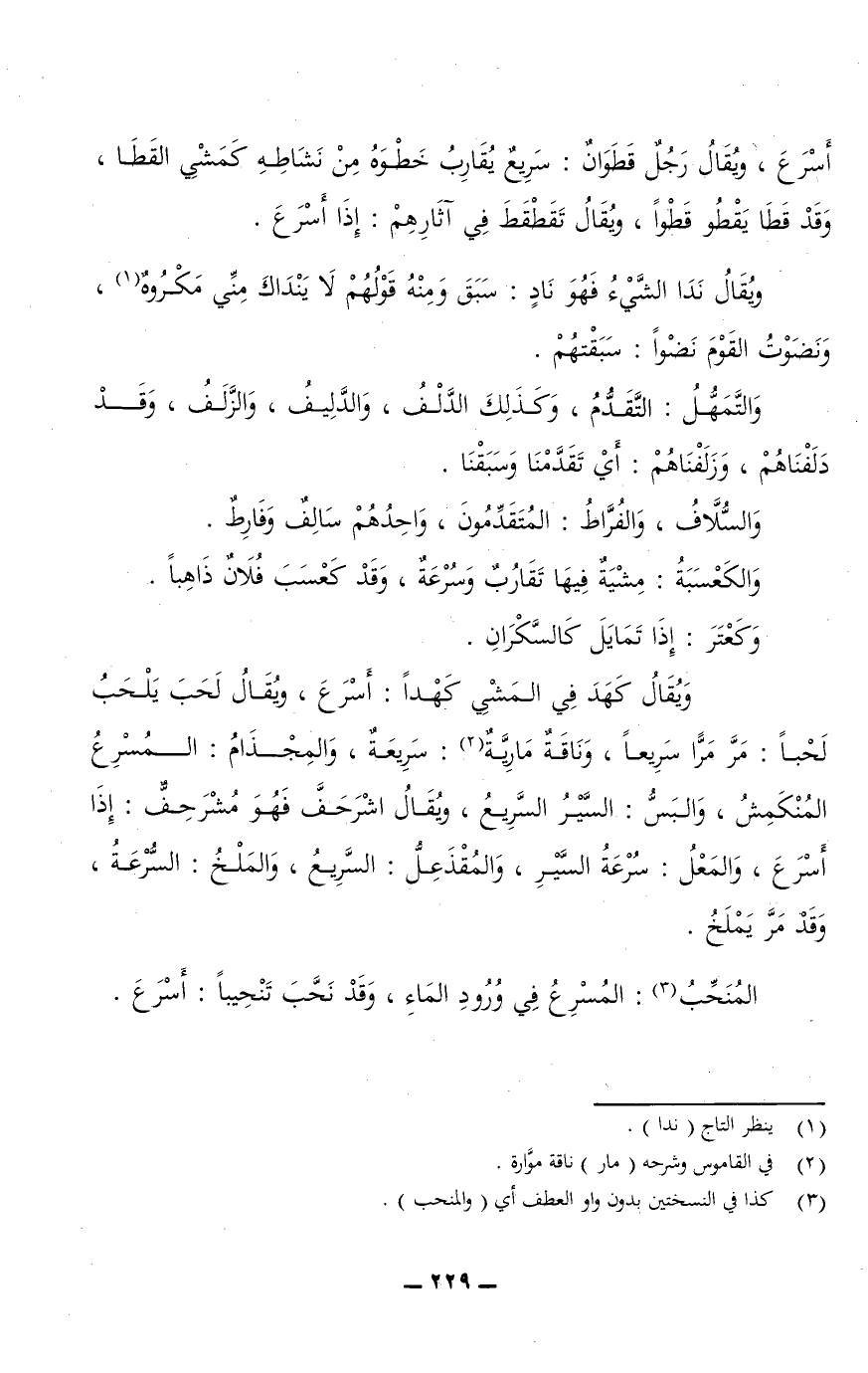 ويقال كَهَدَ فِي الَمْشِي كَهْدًا: أسرع، ويقال لَحَبَ يَلْحَبُ لَحْبًا: مَرَّ مَرًّا سريعًا، وناقة مَارِيَّةٌ: سريعة، والمِجْذَامُ: المسرع المُنْكَمِشُ، والبَسُّ: السَّيْرُ السريع، ويقال اشْرَحَفَّ فهو مُشْرَحِفٌّ: إذا أسرع، والمعل: سرعة السير، والمُقْذَعِلُّ: السريع، والمَلْخُ: السرعة، وقد مَرَّ يَمْلَخُ.