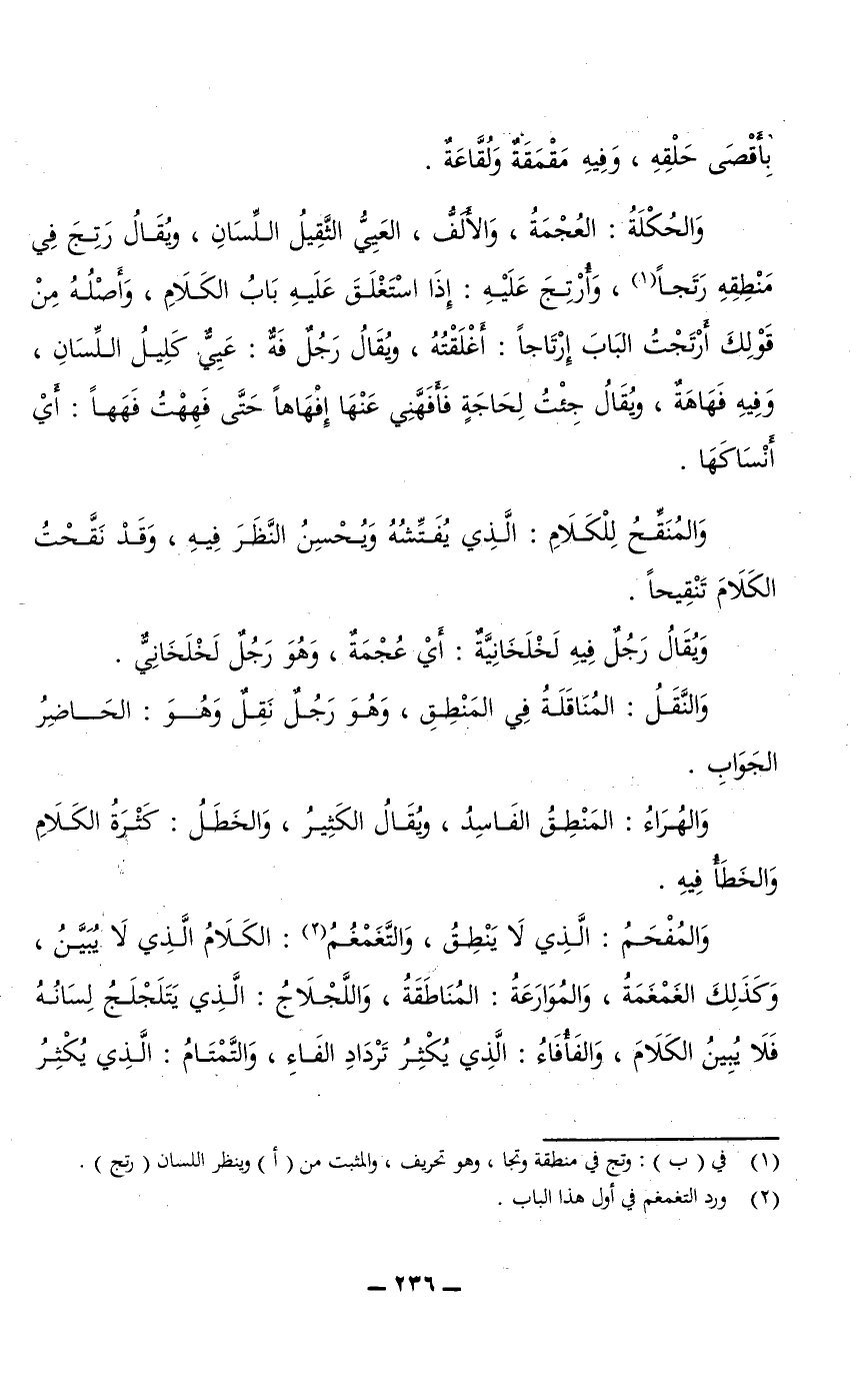 والمُفْحَمُ: الذي لا ينطق، والتَّغَمْغُمُ: الكلام الذي لا يُبَيَّنُ، وكذلك الغَمْغَمَةُ، والمُوَارَعَةُ: المُنَاطَقَةُ، واللَّجْلَاجُ: الذي يَتَلَجْلَجُ لِسَانُهُ فلا يُبِينُ الكلام، والفَأُفَاءُ: الذي يكثر تَرْدَادِ الفاء، والتَّمْتَامُ: الذي يكثر