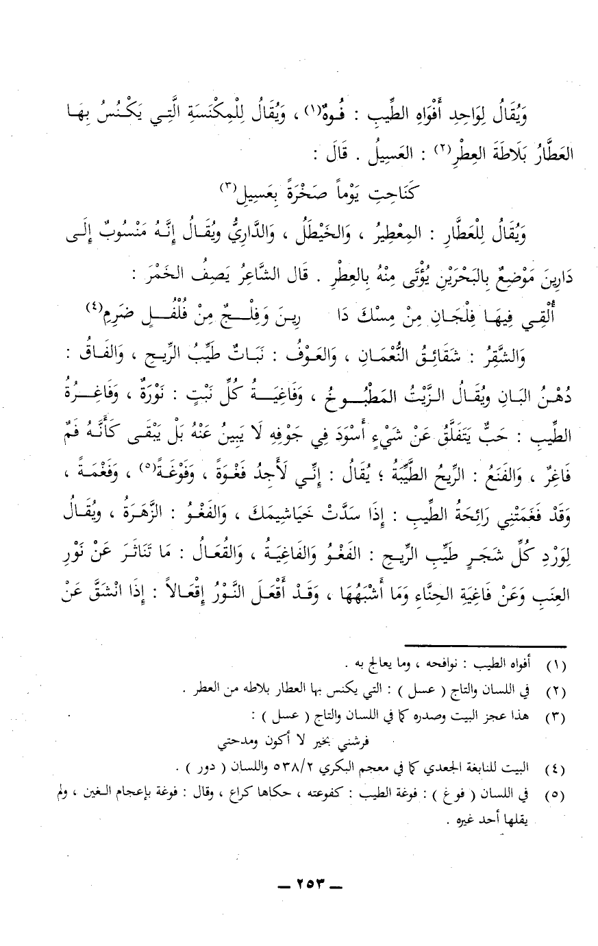 وَيُقَالُ لِوَاحِدِ أَفْوَاهِ الطِّيبِ: فُوهٌ، وَيُقَالُ لِلْمِكْنَسَةِ الَّتِي يَكْنُسُ بِهَا العَطَّار بلاطة العطر: العسيل. قال: