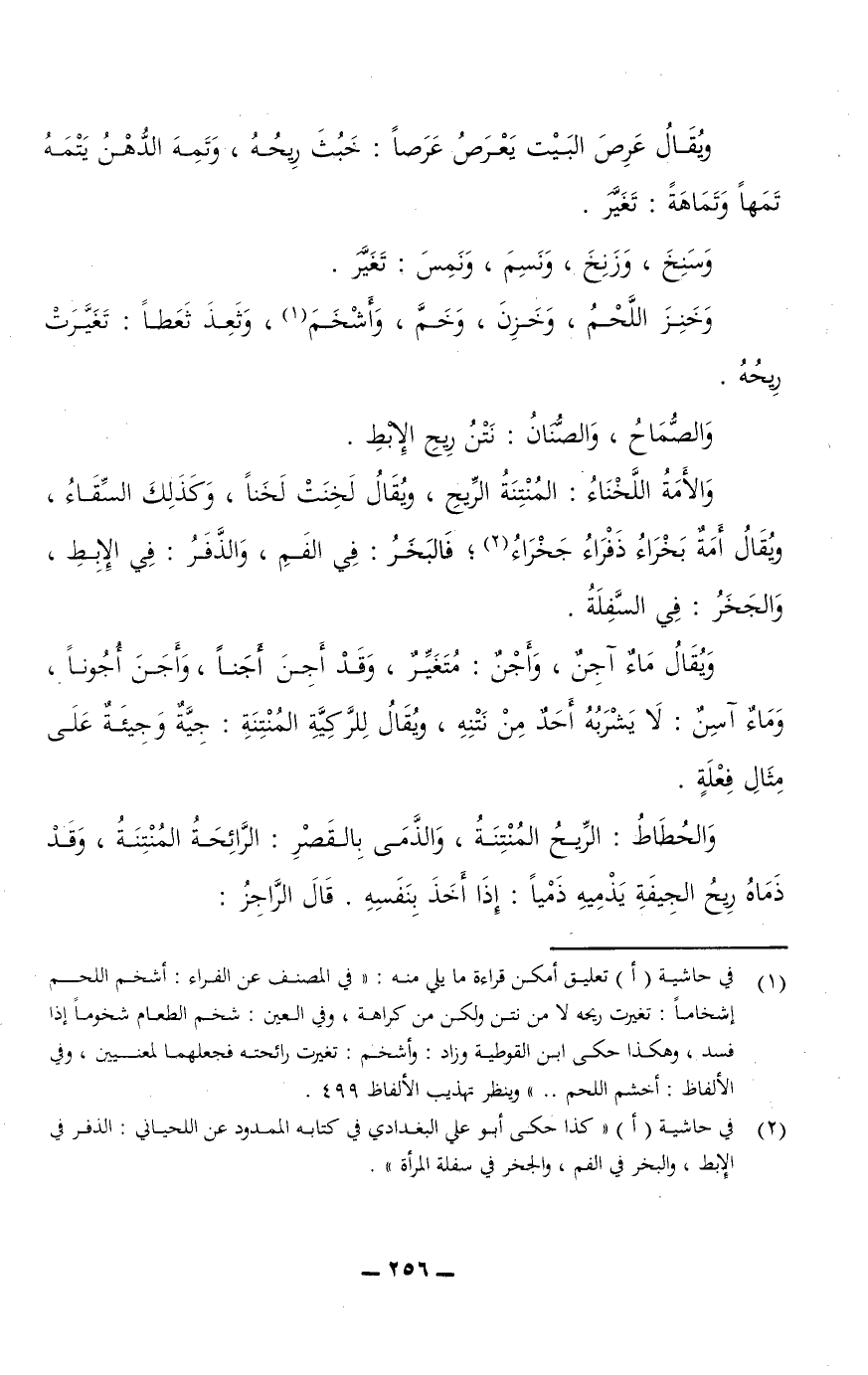 ويقال عَرِصَ البيت يَعْرَصُ عَرَصًا: خَبُثَ رِيحُهُ، وتَمِهَ الدُّهْنُ يَتْمَهُ تَمَهًا وَتَمَاهَةً: تَغَيَّرَ.