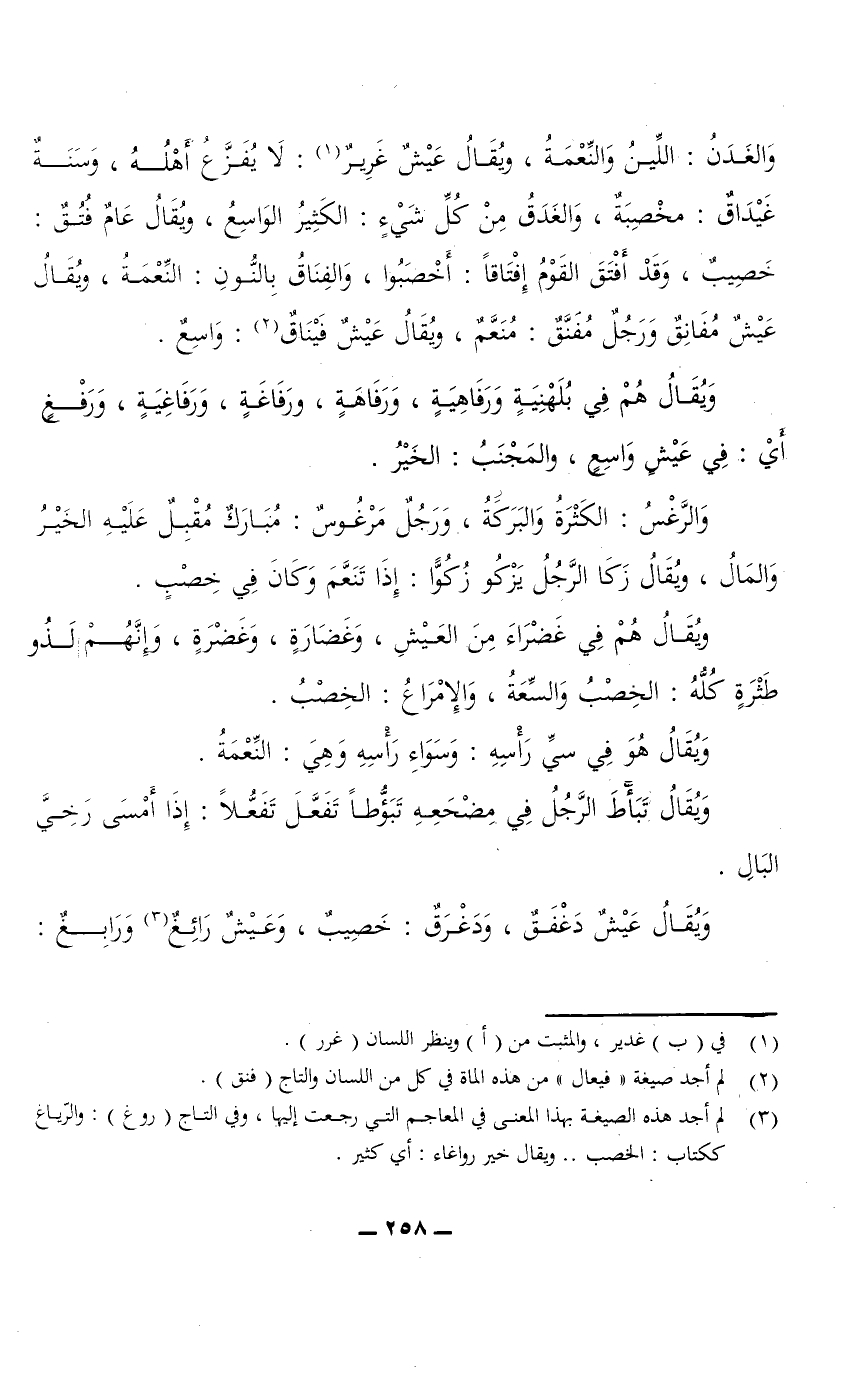 والغَدَنُ: اللِّينُ والنِّعْمَةُ، ويقال عَيْشٌ غَرِيرٌ: لا يُفَزَّعُ أهله، وسَنَةٌ غَيْدَاقٌ: مخْصِبَةٌ، والغَدَقُ من كل شيء: الكثير الواسع، ويقال عام فُتُقٌ: خَصِيبٌ، وقد أَفْتَقَ القوم إِفْتَاقًا: أَخْصَبُوا، والفِنَاقُ بالنون: النِّعْمَةُ، ويقال عيش مُفَانِقٌ ورجل مُفَنَّقٌ: مُنَعَّمٌ، ويقال عيش فَيْنَاقٌ: واسع.