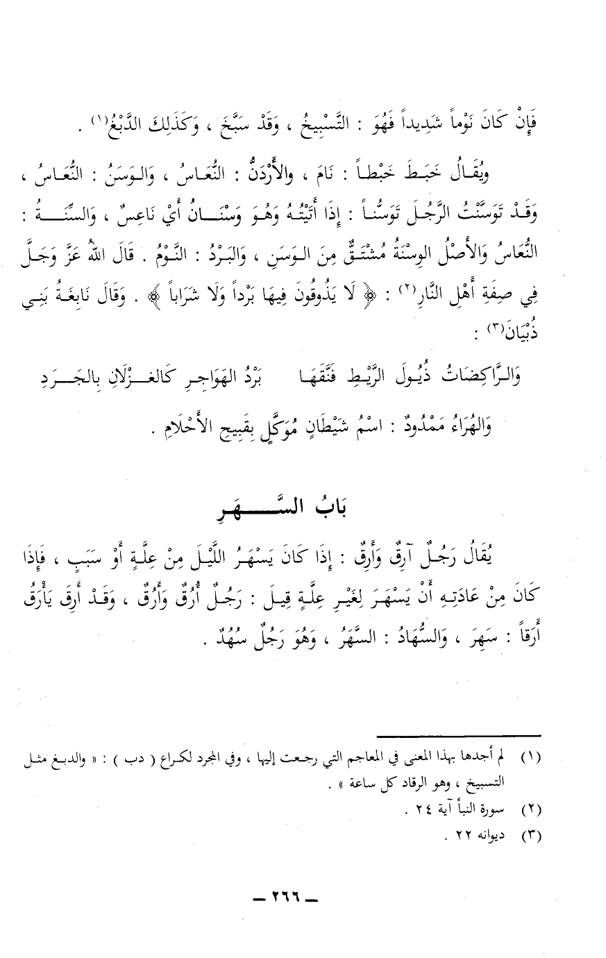 ويقال خَبَطَ خَبْطًا: نام، والأَرْدَنُّ: النُّعَاسُ، والوسن: النعاس، وقد تَوَسَّنْتُ الرجل تَوَسُّنًا: إذا أتيته وهو وَسْنَانُ أي نَاعِسٌ، والسِّنَةُ: النُّعَاسُ والأصل الوِسْنَةُ مُشْتَقٌّ من الوَسَنِ، والبَرْدُ: النَّوْمُ. قال الله عَزَّ وَجَلَّ في صفة أهل النار: {لَا يَذُوقُونَ فِيهَا بَرْدًا وَلَا شَرَابًا}. وقال نابغة بني ذبيان: