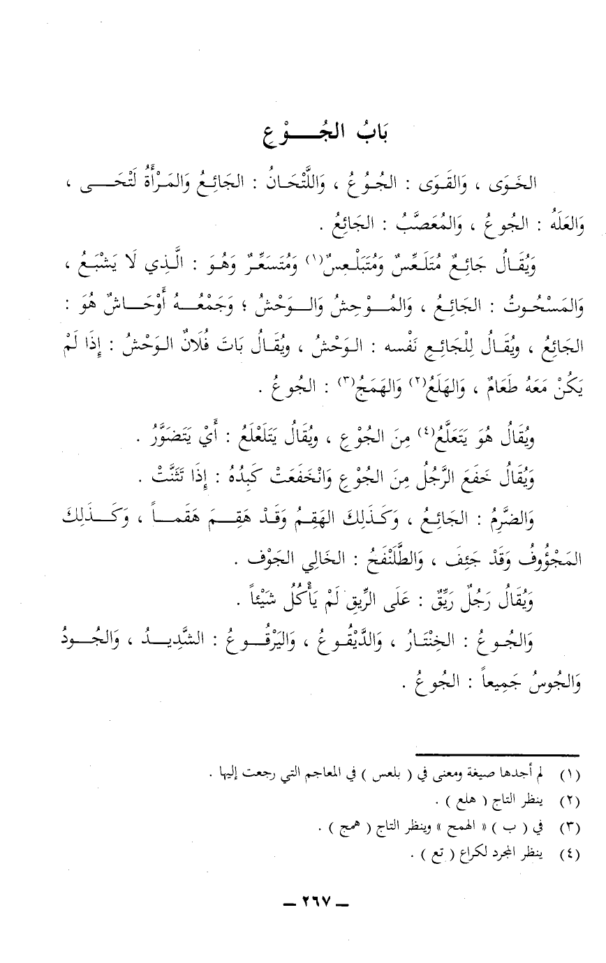ويقال جائع مُتَلَعِّسٌ ومُتَبَلْعِسٌ ومُتَسَعِّرٌ وهو: الذي لا يَشْبَعُ، والمَسْحُوتُ: الجائع، والمُوْحِشُ والوَحْشُ؛ وجمعه أَوْحَاشٌ هو: الجائع، ويقال للجائع نفسه: الوَحْشُ، ويقال بات فلان الوَحْشُ: إذا لم يكن معه طعام، والهَلَعُ والهَمَجُ: الجُوعُ.
