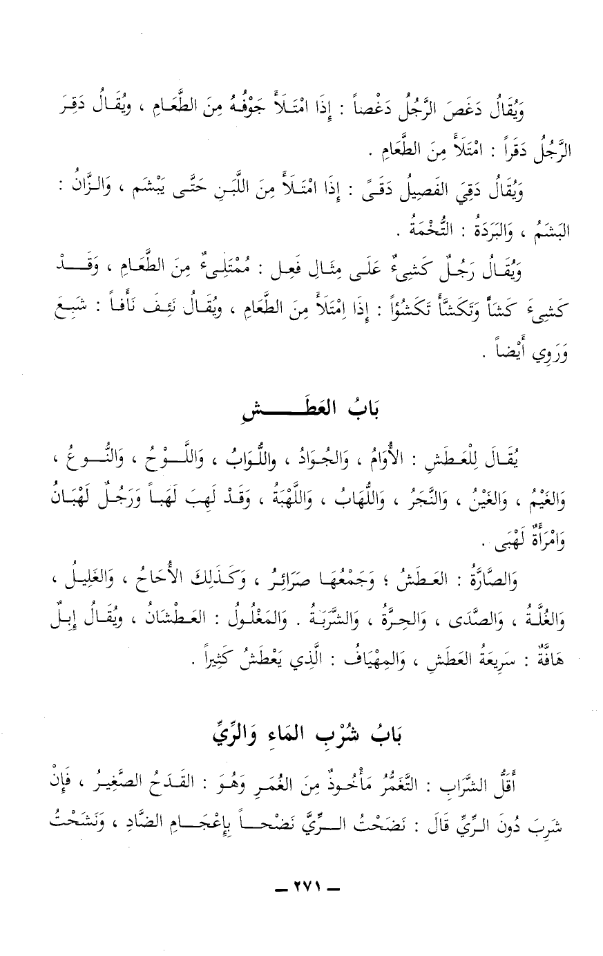 أقل الشراب: التَّغَمُّرُ مأخوذ من الغُمَرِ وهو: القدح الصغير، فإن شَرِبَ دون الري، قال: نَضَحْتُ الرَّيَّ نَضْحًا بإعْجَامِ الضَّادِ، ونَشَحْتُ