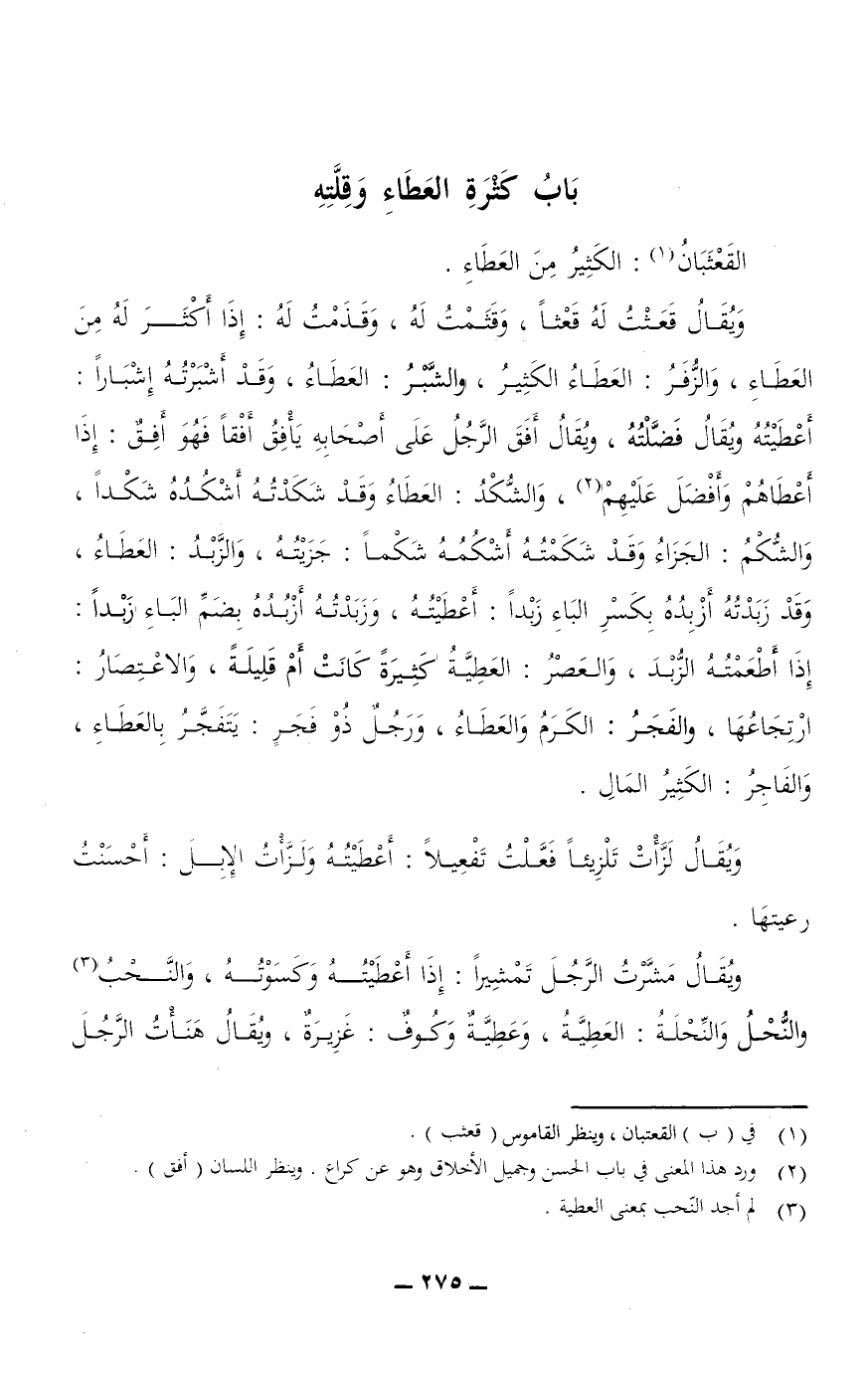 ويقال قَعَثْتُ لَهُ قَعْثًا، وَقَثَمْتُ لَهُ، وَقَذَمْتُ له: إذا أكثر له من العَطَاءِ، والزُّفَرِ: العطاء الكثير، والشَّبْرُ: العَطَاءُ، وقد أَشْبَرْتُهُ إِشْبَارًا: أعطيته ويقال فَضَّلْتُهُ، ويقال أَفَقَ الرجل على أصحابه يَافِقُ أَفْقًا فهو أَفِقٌ: إذا أعطاهم وأفضل عليهم، والشُّكْدُ: العطاء وقد شَكَدْتُهُ أَشْكُدُهُ شَكْدًا، والشُّكْمُ: الجَزَاءُ وقد شَكَمْتُهُ أَشْكُمُهُ شَكْمًا: جَزَيْتُهُ، والزَّبْدُ: العَطَاءُ، وقد زَبَدْتُهُ أَزْبِدُهُ بكسر الباء زَبَدًا: أعطيته، وزَبَدتُهُ أَزْبُدُهُ بضم الباء زَبْدًا: إذا أَطْعَمْتُهُ الزُّبْدَ، والعَصْرُ: العَطِيَّةُ كثيرة كانت أم قليلة، والاعتصار: ارْتِجَاعُهَا، والفَجَرُ: الكرم والعطاء، ورجل ذو فَجَرٍ: يَتَفَجَّرُ بالعطاء، والفاجر: الكثير المال.