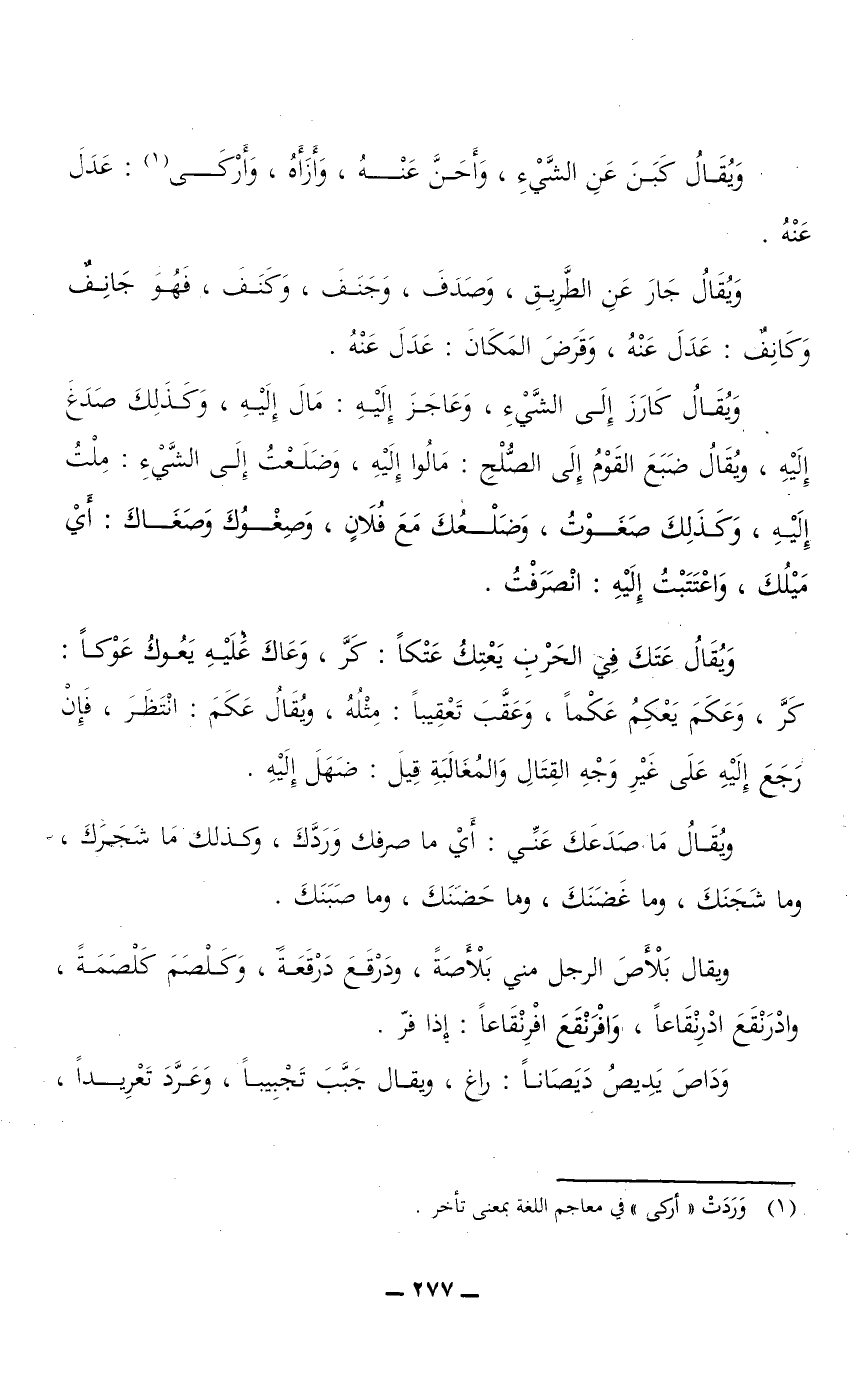 ويقال كَارَزَ إلى الشيء، وعاجز إليه: مال إليه، وكذلك صَدَغَ إليه، ويقال ضَبَعَ القوم إلى الصُّلْحِ: مالوا إليه، وضَلَعْتُ إلى الشيء: مِلْتُ إليه، وكذلك صَغَوْتُ، وضَلْعُكَ مع فلان، وصِغْوُكَ وصَغَاكَ: أي مَيْلُكَ، واعْتَتَبْتُ إِلَيْهِ: انصرفت.