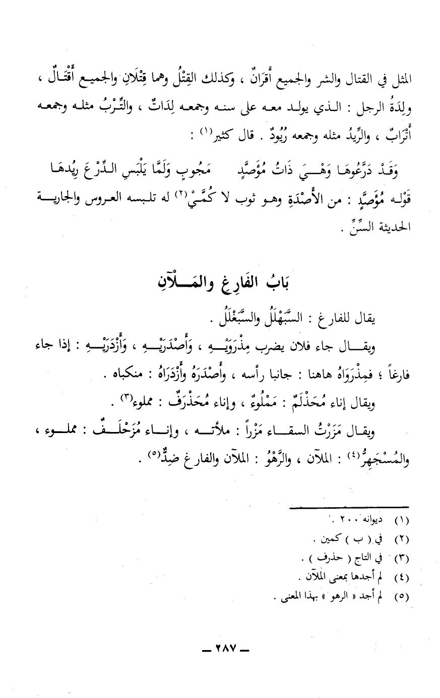 المثل في القتال والشر والجميع أَقْرَانٌ، وكذلك القِتْلُ وهما قِتْلَانِ والجميع أَقْتَالٌ، ولدَةُ الرجل: الذي يولد معه على سنه وجمعه لِدَاتٌ، والتِّرْبُ مثله وجمعه أَتْرَابٌ، والرِّيدُ مثله وجمعه رُيُودٌ.