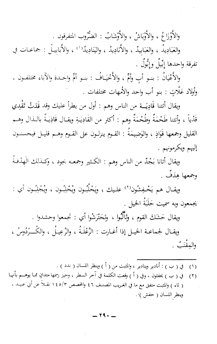 ويقال أتتنا قَادِيَة من الناس وهم: أول من يطرأ عليك وقد قَدَتْ تَقْدِي قَدْيًا، وأتتنا طَحْمَةٌ وطُحْمَةٌ وهم: أكثر من القَادِيَةِ ويقال قَاذِيَةٌ بالذال وهم القليل وجمعها قَوَاذٍ، والوَضِيمَةُ: القوم ينزلون على القوم وهم قليل فيحسنون إليهم ويكرمونهم.