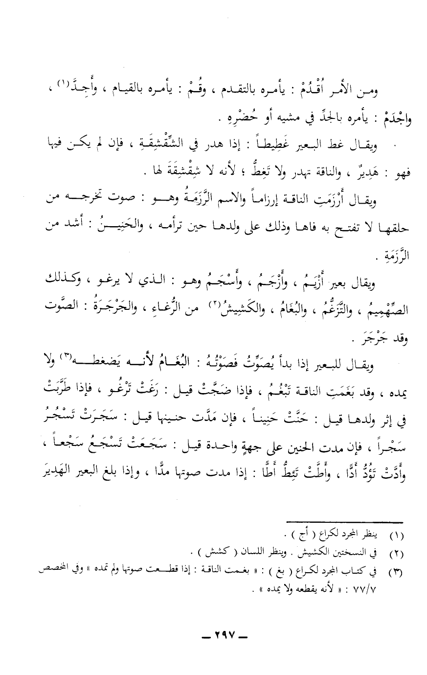 ويقال بعير أَزْيَمُ، وأَزْجَمُ، وأَسْجَمُ وهو: الذي لا يرغو، وكذلك الصِّهْمِيمُ، والتَّزَغُّمُ، والبُغَامُ والكَشِيشُ من الرُّغَاءِ، والجَرْجَرَةُ: الصوت وقد جَرْجَرَ.