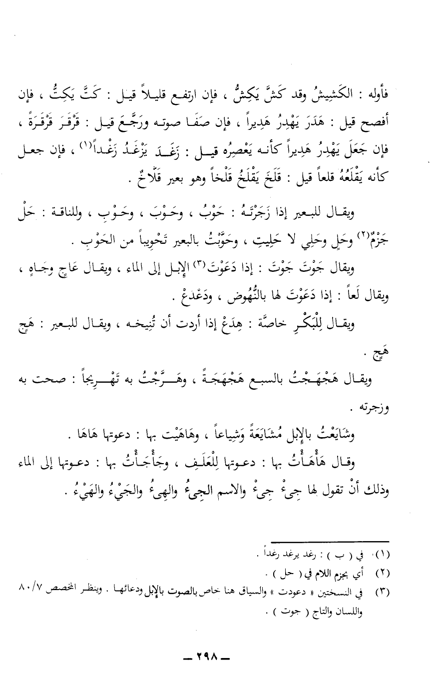 فأوله: الكَشِيشُ وقد كَشَّ يَكِشُّ، فإن ارتفع قليلًا قيل: كَتَّ يَكِتُّ، فإن أفصح قيل: هَدَرَ يَهْدِرُ هَدِيرًا، فإن صَفَا صوته ورَجَّعَ قيل: قَرْقَرَ قَرْقَرَةً، فإن جعل يَهْدِرُ هَدِيرًا كأنه يَعْصِرُهُ قيل: زَغَدَ يَزْغَدُ زَغْدًا، فإن جعل كأنه يَقْلَعُهُ قَلْعًا قيل: قَلَخَ يَقْلَخُ قَلْخًا وهو بعير قَلَّاخٌ.