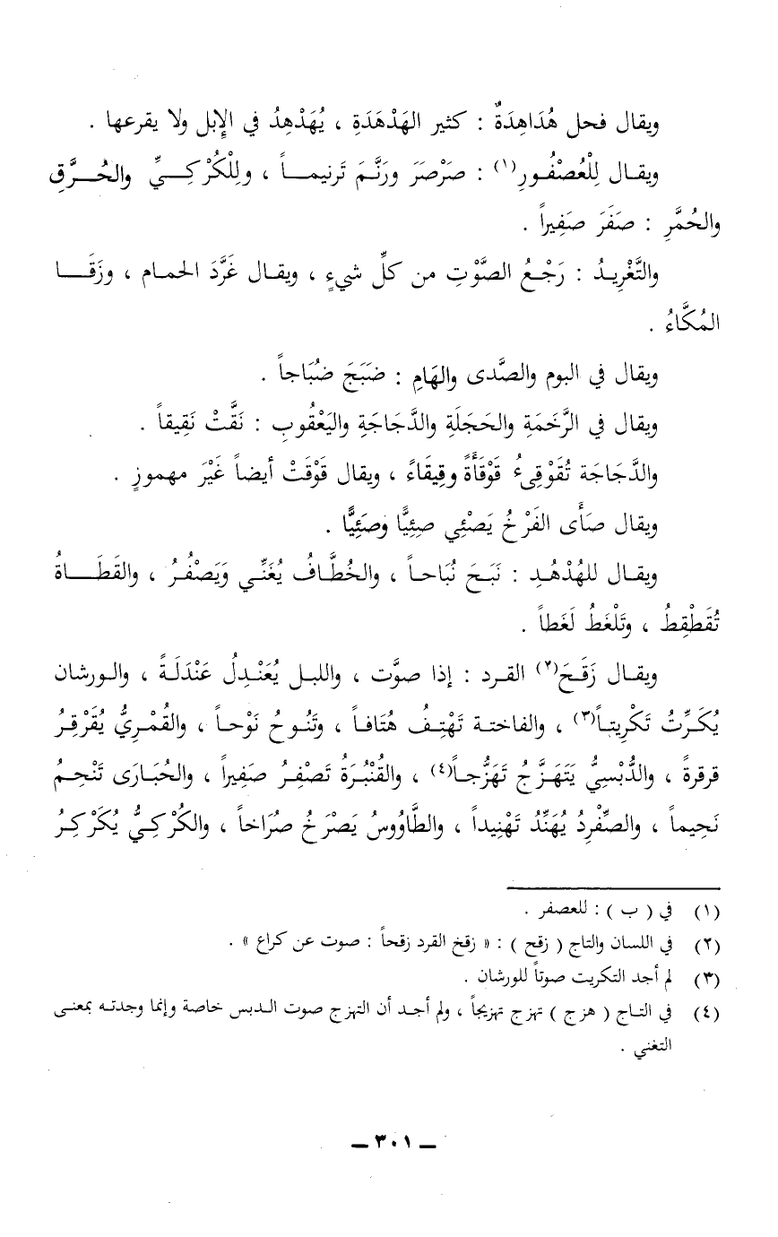 ويقال زَقَحَ القرد: إذا صوَّت، واللبل يُعَنْدِلُ عَنْدَلَةً، والورشان يُكَرِّتُ تَكْرِيتًا، والفاختة تَهْتِفُ هُتَافًا، وتنوح نَوْحًا، والقُمْرِيُّ يقرقر قرقرةً، والدُّبسي يتهزَّج تَهَزُّجًا، والقُنْبُرَةُ تَصْفِرُ صفيرًا، والحُبَارى تَنْحِمُ نَحِيمًا، والصِّفْرِدُ يُهَنِّدُ تهنيدًا، والطاووس يصرخ صُرَاخًا، والكُرْكِيُّ يُكَرْكِرُ