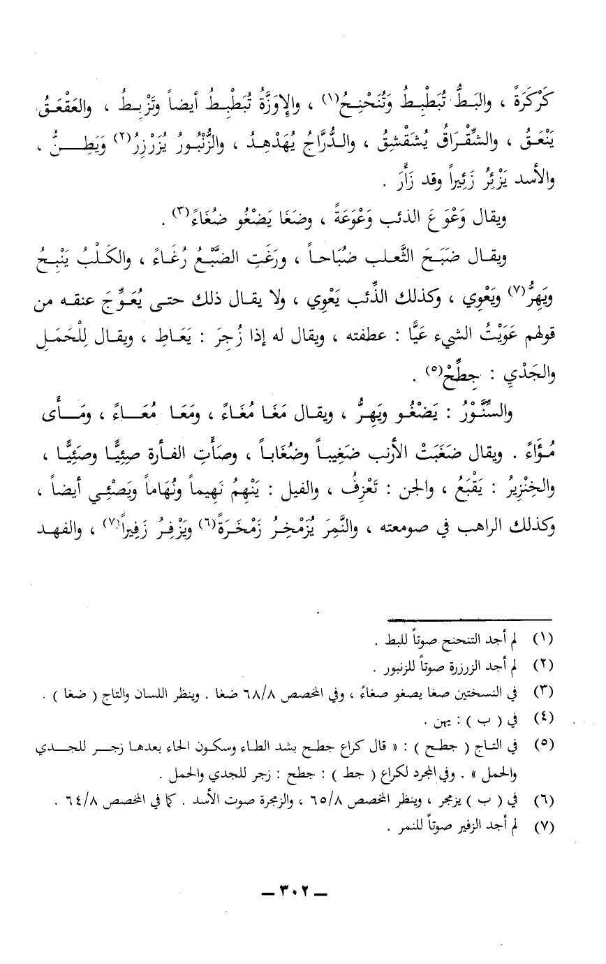 كركرةً، والبط تُبَطْبِطُ وتُنَحْنِحُ، والإوَزَّة تُبَطْبِطُ أيضًا وتَزْبِطُ، والعَقْعَقُ يَنْعَقُ، والشِّقْرَاقُ يُشَقْشِقُ، والدُّرَّاجُ يهدهد، والزُّنبور يُزَرْزِرُ ويَطِنُّ، والأسد يَزْئِرُ زئيرًا وقد زَأَرَ.