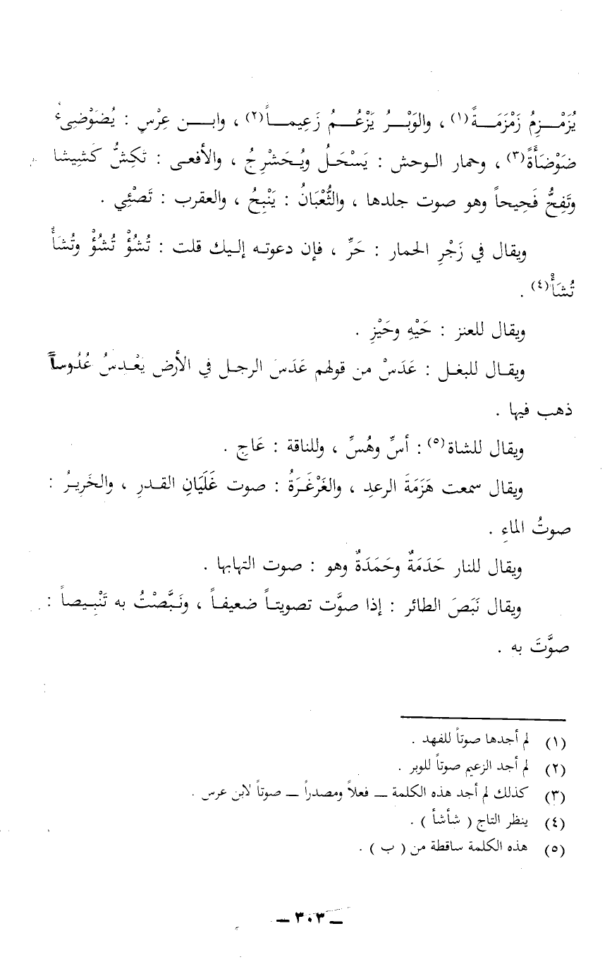 يزمزم زمزمةً، والوَبْرُ يَزْعُمُ زعيمًا، وابن عِرْسٍ: يضوضئ ضوضأةً، وحمار الوحش: يَسْحَلُ ويُحَشْرِجُ، والأفعى: تَكِشُّ كَشِيشًا وتَفِحُّ فَحِيحًا وهو صوت جلدها، والثعبان: يَنْبِحُ، والعقرب: تَصْئِي.