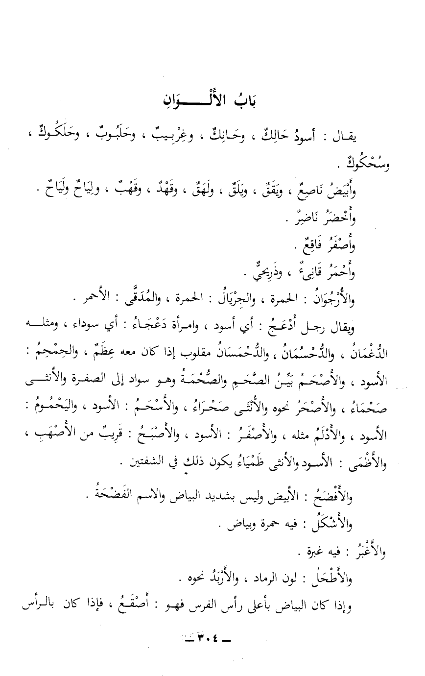 ويقال رجل أَدْعَجُ: أي أسود، وامرأة دَعْجَاءُ: أي سوداء، ومثله الدُّغْمَانُ، والدُّحْسُمَانُ، والدُّحْمَسَانُ مقلوب إذا كان معه عِظَمٌ، والحِمْحِمُ: الأسود، والأَصْحَمُ بَيِّنُ الصَّحَمِ، والصُّحْمَةُ وهو سواد إلى الصفرة والأنثى صَحْمَاءُ، والأَصْحَرُ نحوه والأنثى صَحْرَاءُ، والأَسْحَمُ: الأسود، واليَحْمُومُ: الأسود، والأَدْلَمُ مثله، والأصفر: الأسود، والأَصْبَحُ: قريب من الأَصْهَبِ، والأَظْمَى: الأسود والأنثى ظَمْيَاءُ يكون ذلك في الشفتين.