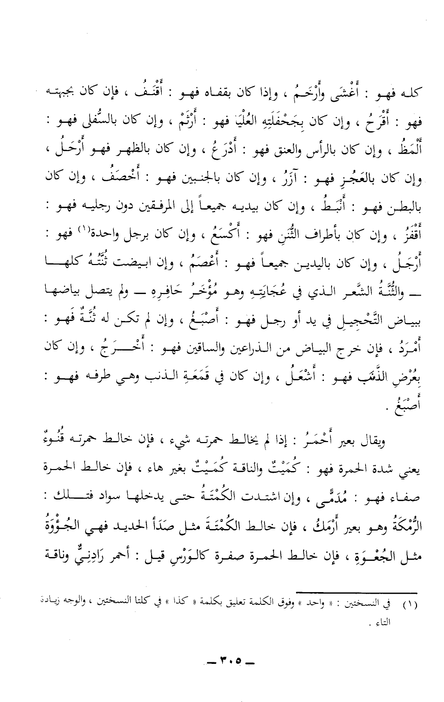 ويقال بعير أحمر: إذا لم يخالط حمرته شيء، فإن خالط حمرته قُنُوءٌ يعني شدة الحمرة فهو: كُمَيْتٌ والناقة كُمَيْتٌ بغير هاء، فإن خالط الحمرة صفاء فهو: مُدَمًّى، وإن اشتدت الكُمْتَةُ حتى يدخلها سواد فتلك: الرُّمْكَةُ وهو بعير أَرْمَكُ، فإن خالط الكُمْتَةَ مثل صَدَأِ الحديد فهي الجُؤْوَةُ مثل الجُعْوَةِ، فإن خالط الحمرة صفرة كالوَرْسِ قيل: أحمر رَادِنِيُّ وناقة