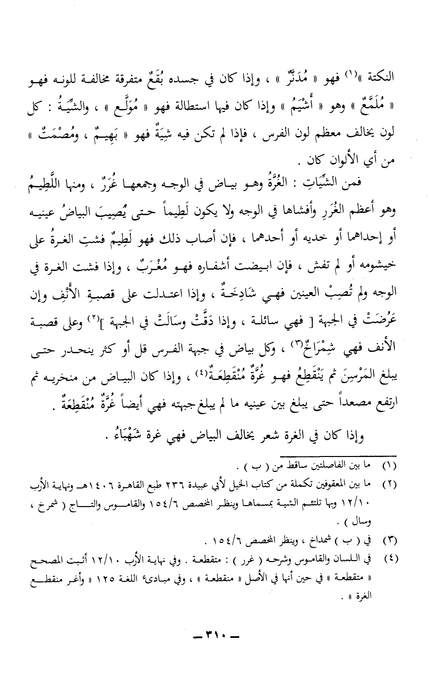 النكتة" فهو "مُدَنَّرٌ"، وإذا كان في جسده بُقَعٌ متفرقة مخالفة للونه فهو "مُلَمَّعٌ" وهو "أَشْيَمُ" وإذا كان فيها استطالة فهو "مُوَلَّع"، والشِّيَةُ: كل لون يخالف معظم لون الفرس، فإذا لم تكن فيه شية فهو "بَهِيمٌ، ومُصْمَتٌ" من أي الألوان كان.