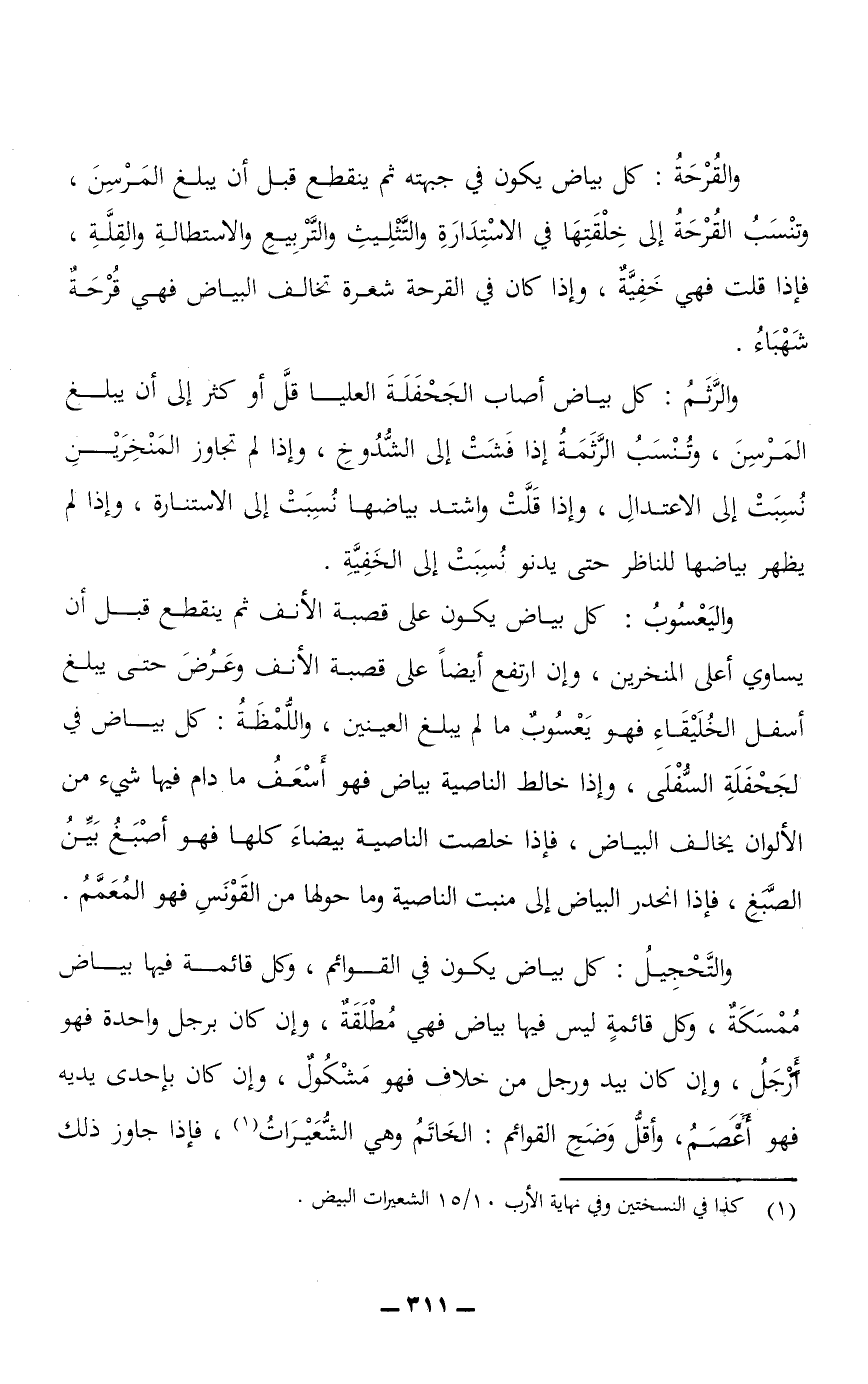 واليعسوب: كل بياض يكون على قصبة الأنف ثم ينقطع قبل أن يساوي أعلى المنخرين، وإن ارتفع أيضًا على قصبة الأنف وعَرُضَ حتى يبلغ أسفل الخُلَيْقَاءِ فهو يعسوب ما لم يبلغ العينين، واللُّمْظَةُ: كل بياض في الجَحْفَلَةِ السُّفْلَى، وإذا خالط الناصية بياض فهو أَسْعَفُ ما دام فيها شيء من الألوان يخالف البياض، فإذا خلصت الناصية بيضاءَ كلها فهو أَصْبَغُ بَيِّنُ الصَّبَغِ، فإذا انحدر البياض إلى منبت الناصية وما حولها من القَوْنَسِ فهو المُعَمَّمُ.