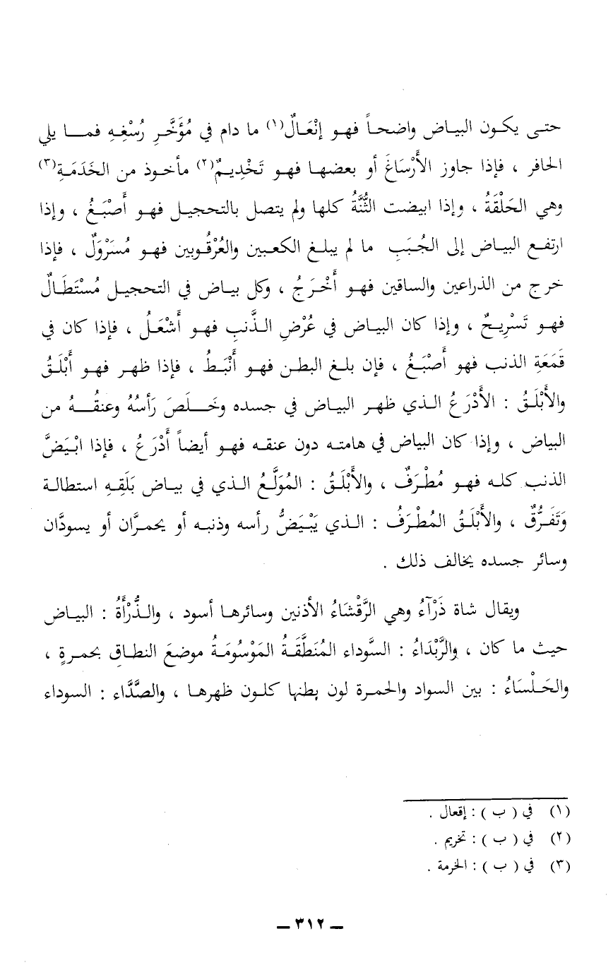 حتى يكون البياض واضحًا فهو إِنْعَالٌ ما دام في مُؤَخَّرِ رُسْغِهِ فما يلي الحافر، فإذا جاوز الأَرْسَاغَ أو بعضها فهو تَخْدِيمٌ مأخوذ من الخَدَمَةِ وهي الحَلْقَةُ، وإذا ابيضت الثُّنَّةُ كلها ولم يتصل بالتحجيل فهو أَصْبَغُ، وإذا ارتفع البياض إلى الجُبَبِ ما لم يبلغ الكعبين والعُرْقُوبَيْنِ فهو مُسَرْوَلُ، فإذا خرج من الذراعين والساقين فهو أَخْرَجُ، وكل بياض في التحجيل مُسْتَطَالٌ فهو تَسْرِيحٌ، وإذا كان البياض في عرض الذنب فهو أَشْعَلُ، فإذا كان في قَمَعَةِ الذنب فهو أَصْبَغُ، فإن بلغ البطن فهو أَنْبَطُ، فإذا ظهر فهو أَبْلَقُ، والأبلق: الأَدْرَعُ الذي ظهر البياض في جسده وخلص رأسُه وعنقُه من البياض، وإذا كان البياض في هامته دون عنقه فهو أيضًا أدرع، فإذا ابيضَّ الذنبُ كله فهو مُطْرَفٌ، والأَبْلَقُ: المُوَلَّعُ الذي في بياض بَلَقِهِ استطالة وتَفَرُّقٌ، والأبلق المُطْرَفُ: الذي يَبْيَضُّ رأسه وذنبه أو يحمَرَّان أو يسودَّان وسائر جسده يخالف ذلك.