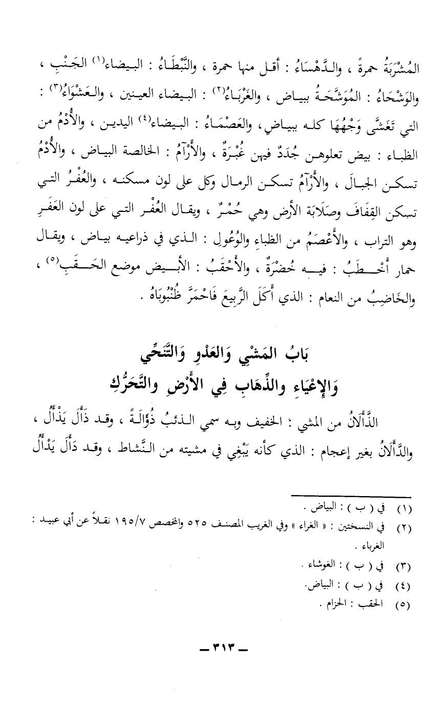 المُشْرَبَةُ حُمْرَةً، والدَّهْسَاءُ: أقل منها حمرة، والنَّبْطَاءُ: البيضاء الجنب، والوَشْحَاءُ: المُوَشَّحَةُ ببياض، والغَرْبَاءُ: البيضاء العينين، والعَشْوَاءُ: التي تَغَشَّى وجهها كله ببياض، والعَصْمَاءُ: البيضاء اليدين، والأُدْمُ من الظباء: بيض تعلوهن جُدَدٌ فيهن غُبْرَةٌ، والأَرْآمُ: الخالصة البياض، والأُدْمُ تسكن الجبالَ، والأَرْآمُ تسكن الرمال وكل على لون مسكنه، والعُفْرُ التي تسكن القِفَافَ وصَلابَة الأرض وهي حُمْرٌ، ويقال العُفْر التي على لون العَفَرِ وهو التراب، والأعصم من الظباء والوُعُولِ: الذي في ذراعيه بياض، ويقال حمار أَخْطَبُ: فيه خضرة، والأَحْقَبُ: الأبيض موضع الحَقَبِ، والخَاضِبُ من النعام: الذي أكل الربيعَ فاحمَرَّ ظُنْبُوبَاهُ.