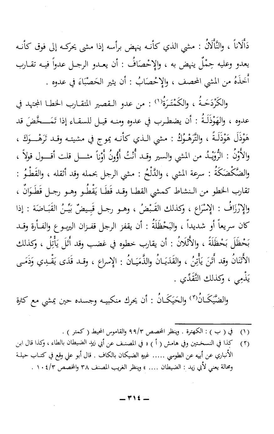 والكَرْدَحَةُ، والكَمْتَرَةُ: من عدو القصير المتقارب الخُطا المجتهد في عدوه، والهَوْذَلَةُ: أن يضطرب في عدوه ومنه قيل للسقاء إذا تَمَخَّضَ قد هَوْذَلَ هَوْذَلَةً، والتَّرَهْوُكُ: مشي الذي كأنه يموج في مشيته وقد تَرَهْوَكَ، والأَوْنُ: الرُّوَيْدُ من المشي والسير وقد أُنْتُ أَؤُونُ أَوْنًا مثل قُلْتُ أَقُولُ قَوْلًا، والضَّكْضَكَةُ: سرعة المشي، والدَّلْحُ: مشي الرجل بحمله وقد أثقله، والقَطْوُ: تقارب الخطو من النشاط كمشي القطا، وقد قَطَا يَقْطُو وهو رجل قَطَوَانٌ، والإِرْزَافُ: الإسراع، وكذلك القبض، وهو رجل قَبِيضٌ بَيِّنُ القَبَاضَةِ: إذا كان سريعًا أو شديدًا، والبَحْظَلَةُ: أن يقفز الرجل قفزان اليربوع والفأرة وقد بَحْظَلَ بَحْظَلَةً، والأَتْلانُ: أن يقارب خطوه في غضب وقد أَتَلَ يَاتِلُ، وكذلك الأَتَنَانُ وقد أَتَنَ يَاتِنُ، والقَدَيَانُ والذَّمَيَانُ: الإسراع، وقد قَدَى يَقْدِي وَذَمَى يَذْمِي، وكذلك التَّقَدِّي.