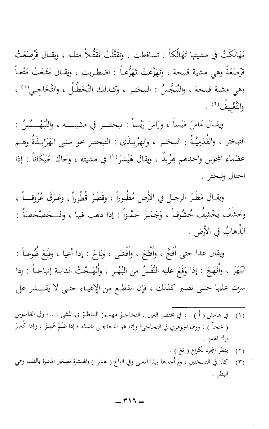 تهالكت في مشيتها تَهَالُكًا: تساقطت، وتقتَّلت تَقَتُّلا مثله، ويقال قَرْصَعَتْ قَرْصَعَةً وهي مشية قبيحة، وتَهَزَّعَتْ تَهَزُّعًا: اضطربت، ويقال مَثَعَتْ مَثْعًا وهي مشية قبيحة، والتَّبَجُّسُ: التَّبَخْتُرُ، وكذلك التَّخَطُّلُ، والتَّخَاجِي، والتَّغْيِيفُ.