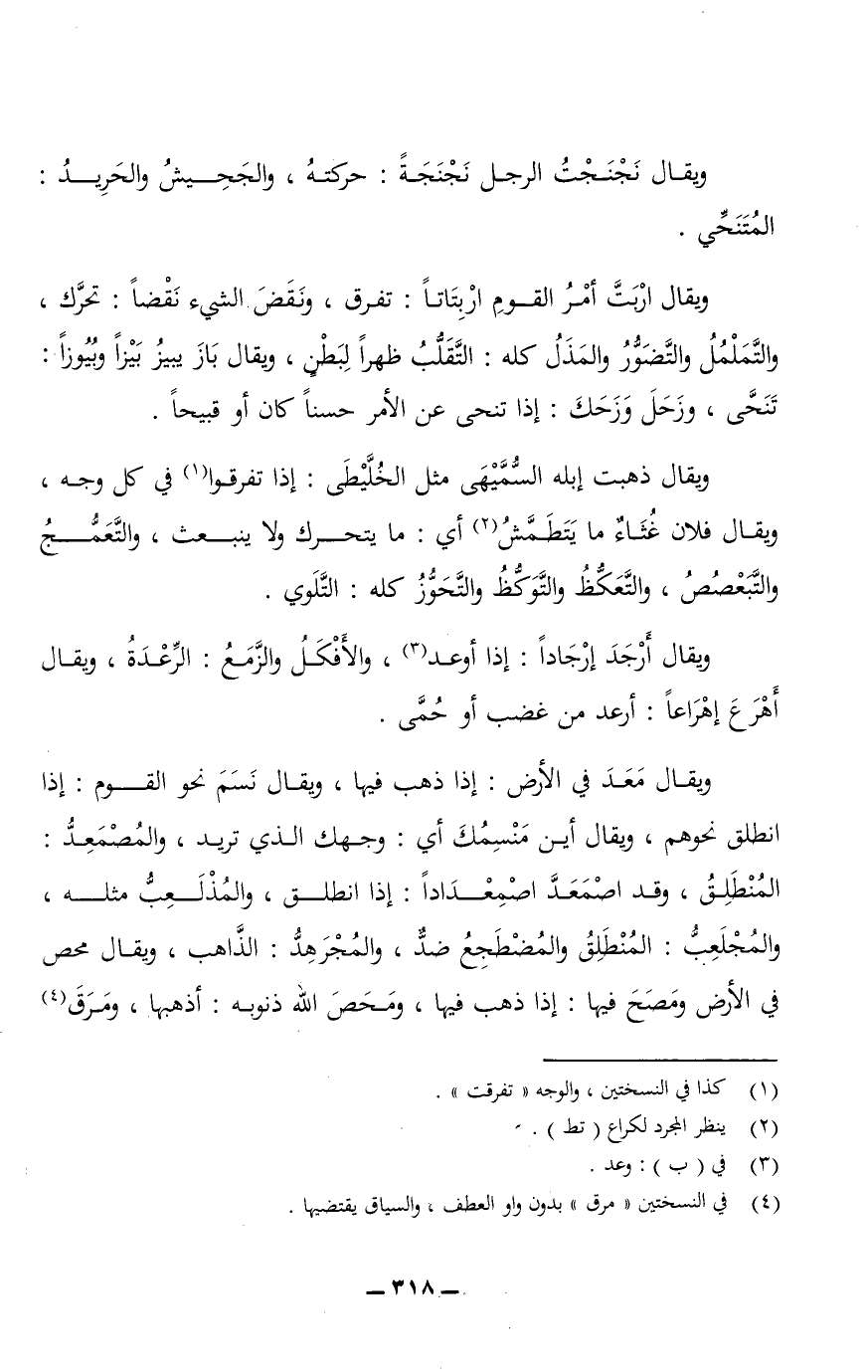 ويقال ارْبَتَّ أمرُ القومِ ارْبِتَاتًا: تفرق، ونقض الشيء نقضًا: تحرك، والتَّمَلْمُلُ والتَّضَوُّرُ والمَذَلُ كله: التَّقَلُّبُ ظهرًا لِبَطْنٍ، ويقال بَازَ يَبِيزُ بَيْزًا وبُيُوزًا: تَنَحَّى، وزَحَلَ وزَحَكَ: إذا تنحى عن الأمر حسنًا كان أو قبيحًا.