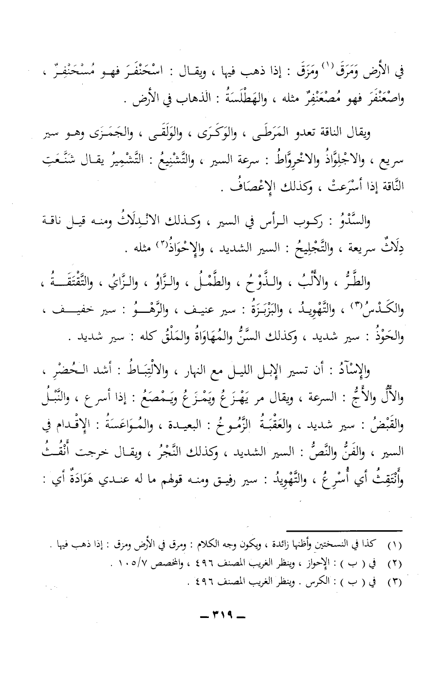 والإِسْآدُ: أن تسير الإبل الليل مع النهار، والالْتِبَاطُ: أشد الحُضْرِ، والأَلُّ والأَجُّ: السرعة، ويقال مر يَهْزَعُ ويَمْزَعُ ويَمْصَعُ: إذا أسرع، والنَّبْلُ والقَبْضُ: سير شديد، والعَقْبَةُ الزَّمُوخُ: البعيدة، والمُوَاعَسَةُ: الإقدام في السير، والفَنُّ والنَّصُّ: السير الشديد، وكذلك النَّجْزُ، ويقال خرجت أَنْقُثُ وأَنْتَقِثُ أي أُسرع، والتَّهْوِيدُ: سير رفيق ومنه قولهم ما له عندي هَوَادَةٌ أي: