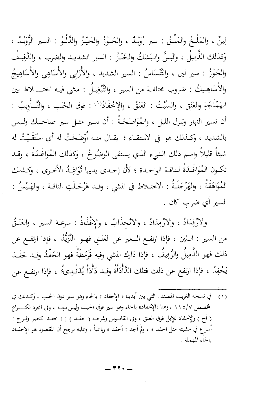 لِينٌ، والمَلْخُ والمَلْقُ: سير رُوَيْدٌ، والحَوْزُ والحَيْزُ والدَّلْوُ: السير الرُّوَيْدُ، وكذلك الذَّمِيلُ، والبَسُّ والبَشْكُ والخَبْزُ: السير الشديد والضرب، والدَّفِيفُ والحَوْزُ: سير لين، والتَّنْسَاسُ: السير الشديد، والأَزَابِي والأَسَاهِي والأَسَاهِيجُ والأَسَاهِيكُ: ضروب مختلفة من السير، والتَّبْغِيلُ: مشي فيه اختلاط بين الهَمْلَجَةِ والعَنَقُ، والسَّبْتُ: العَنَقُ، والإِخْفَادُ: فوق الخَبَبِ، والتَّاوِيبُ: أن تسير النهار وتنزل الليل، والمُوَاضَخَةُ: أن تسير مثل سير صاحبك وليس بالشديد، وكذلك هو في الاستقاء؛ يقال منه أَوْضَحْتُ له أي اسْتَقَيْتُ له شيئًا قليلا واسم ذلك الشيء الذي يستقى الوضُوخُ، وكذلك المُوَاغَدَةُ، وقد تكون المُوَاغَدَةُ للناقة الواحدة؛ لأن إحدى يديها تُوَاغِدُ الأخرى، وكذلك المُوَاهَقَةُ، والهَرْجَلَةُ: الاختلاط في المشي، وقد هَرْجَلَتِ الناقة، والهَيْسُ: السير أي ضرب كان.