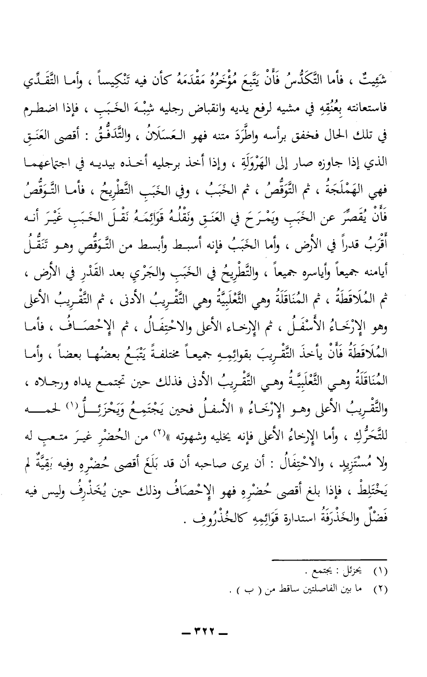 شَئِيتٌ، فأما التَّكَدُّسُ فأن يَتَّبِعَ مؤخره مقدمه كأن فيه تَنْكِيسًا، وأما التَّقَدِّي فاستعانته بعُنُقِهِ في مشيه لرفع يديه وانقباض رجليه شبه الخَبَبِ، فإذا اضطرم في تلك الحال فخفق برأسه واطَّرَدَ متنه فهو العَسَلانُ، والتَّدَفُّقُ: أقصى العَنَقِ الذي إذا جاوزه صار إلى الهَرْوَلَةِ، وإذا أخذ برجليه أخذه بيديه في اجتماعهما فهي الهَمْلَجَةُ، ثم التَّوَقُّصُ، ثم الخَبَبُ، وفي الخَبَبِ التَّطْرِيحُ، فأما التَّوَقُّصُ فأن يُقَصِّرَ عن الخَبَبِ ويمرح في العَنَقِ ونَقْلُهُ قَوَائِمَهُ نَقْلَ الخَبَبِ غير أنه أقرب قدرًا في الأرض، وأما الخَبَبُ فإنه أسبط وأبسط من التَّوَقُّصِ وهو تنقُّلُ أيامنه جميعًا وأياسره جميعًا، والتَّطْرِيحُ في الخَبَبِ والجري بعد القدر في الأرض، ثم المُلاقَطَةُ، ثم المُنَاقَلَةُ وهي الثَّعْلَبِيَّةُ وهي التقريب الأدنى، ثم التقريب الأعلى وهو الإرخاء الأسفل، ثم الإرخاء الأعلى والاحتفال، ثم الإِحْصَافُ، فأما المُلاقَطَةُ فأن يأخذ التقريبَ بقوائمه جميعًا مختلفةً يتبع بعضُها بعضًا، وأما المُنَاقَلَةُ وهي الثَّعْلَبِيَّةُ وهي التَّقريب الأدنى فذلك حين تجتمع يداه ورجلاه، والتقريب الأعلى وهو الإرخاءُ الأسفل فحين يجتمع وَيَحْزَئِلُّ لحمه للتَّحَرُّكِ، وأما الإرخاء الأعلى فإنه يخليه وشهوته من الحُضر غير متعبٍ له ولا مُسْتَزِيدٍ، والاحتفال: أن يرى صاحبه أن قد بلغ أقصى حُضْرِهِ وفيه بقيَّةٌ لم يختلط، فإذا بلغ أقصى حُضْرِهِ فهو الإِحْصَافُ وذلك حين يُخَذْرِفُ وليس فيه فضلٌ والخَذْرَفَةُ استدارة قوائمه كالخُذْرُوفِ.