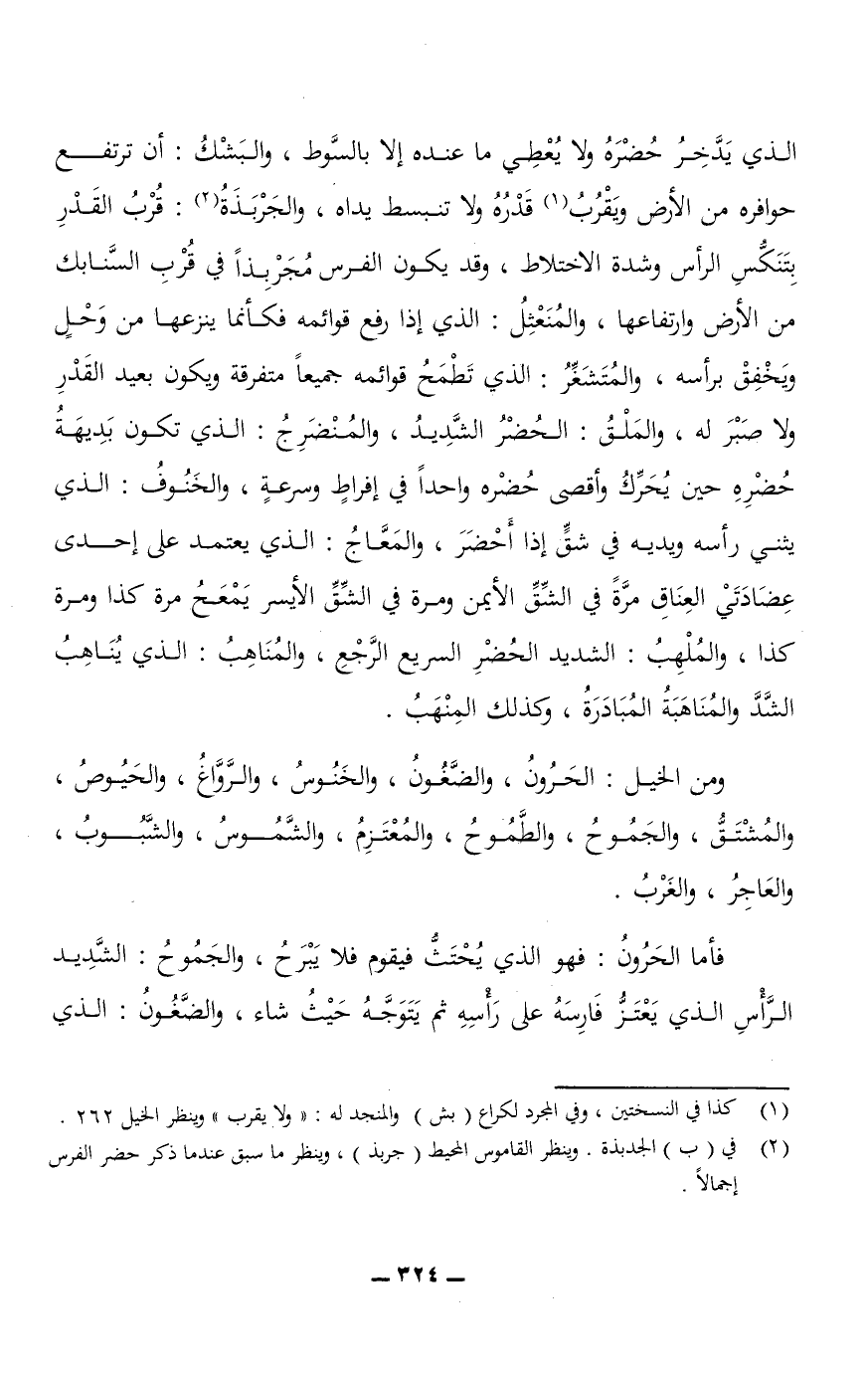 الذي يدَّخِر حُضره ولا يعطي ما عنده إلا بالسَّوط، والبَشْكُ: أن ترتفع حوافره من الأرض ويقرب قدره ولا تنبسط يداه، والجَرْبَذَةُ: قرب القدر بتَنَكُّسِ الرأس وشدة الاختلاط، وقد يكون الفرس مُجَرْبِذًا في قُرب السَّنابك من الأرض وارتفاعها، والمُنَعْثِلُ: الذي إذا رفع قوائمه فكأنما ينزعها من وحل ويخفق برأسه، والمُتَشَغِّرُ: الذي تطمح قوائمه جميعًا متفرقة ويكون بعيد القدر ولا صبر له، والمَلْقُ: الحُضْر الشديد، والمُنْضَرِجُ: الذي تكون بديهة حضره حين يحرك وأقصى حضره واحدًا في إفراطٍ وسرعةٍ، والخَنُوفُ: الذي يثني رأسه في شقٍّ إذا أحضر، والمَعَّاجُ: الذي يعتمد على إحدى عِضَادَتَي العِنَاق مرةً في الشق الأيمن ومرة في الشق الأيسر يَمْعَجُ مرةً كذا ومرةً كذا، والمُلْهِبُ: الشديد الحضر السريع الرَّجع، والمُنَاهِبُ: الذي يُنَاهِبُ الشَّدَّ والمُنَاهَبَةُ المبادرة، وكذلك المِنْهَبُ.