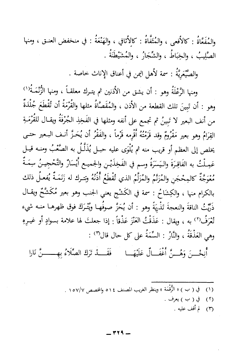 ومنها الرَّعْلَةُ وهو: أن يشق من الأذنين ثم يترك معلقًا، ومنها الزُّنْمَةُ وهو: أن تبين تلك القطعة من الأذن، والمُقَصَّاةُ مثلها والقُرْمَةُ أن تُقطع جُلدَةٌ من أنف البعير لا تبين ثم تجمع على أنفه ومثلها في الفخذ الجُرْفَةُ ويقال للقُرْمَةِ القِرَامُ وهو بعير مَقْرُومٌ وقد قَرَمْتُهُ أَقْرِمُهُ قَرْمًا، والفقر أن يُحَزَّ أنف البعير حتى يخلص إلى العظم أو قريب منه ثم يُلْوَى عليه حبل يُذَلَّلُ به الصعب ومنه قيل عَمِلْتُ به الفَاقِرَةَ، واليَسَرَةُ وسم في الفخذين والجميع أيسار، والتَّحْجِينُ سمة مُعْوَجَّةٌ كالمِحْجَنِ، والمُزَنَّمُ والمُزَلَّمُ الذي تقطع أذنه وتترك له زَنَمَةٌ يفعل ذلك بالكرام منها، والكِشَاحُ: سمة في الكَشْحِ يعني الجنب وهو بعير مُكَشَّحٌ، ويقال ذَرَّيْتُ الناقة والنعجةَ تَذْرِيَةً وهو: أن يُحَزَّ صوفُها ويترك فوق ظهرها منه شيء تُعْرَفُ به، ويقال: عَذَقْتُ العَنْزَ عَذْقًا: إذا جعلت لها علامة بسوادٍ أو غيره وهي العَذْقَةُ، والنَّارُ: السمة على كل حال قال: