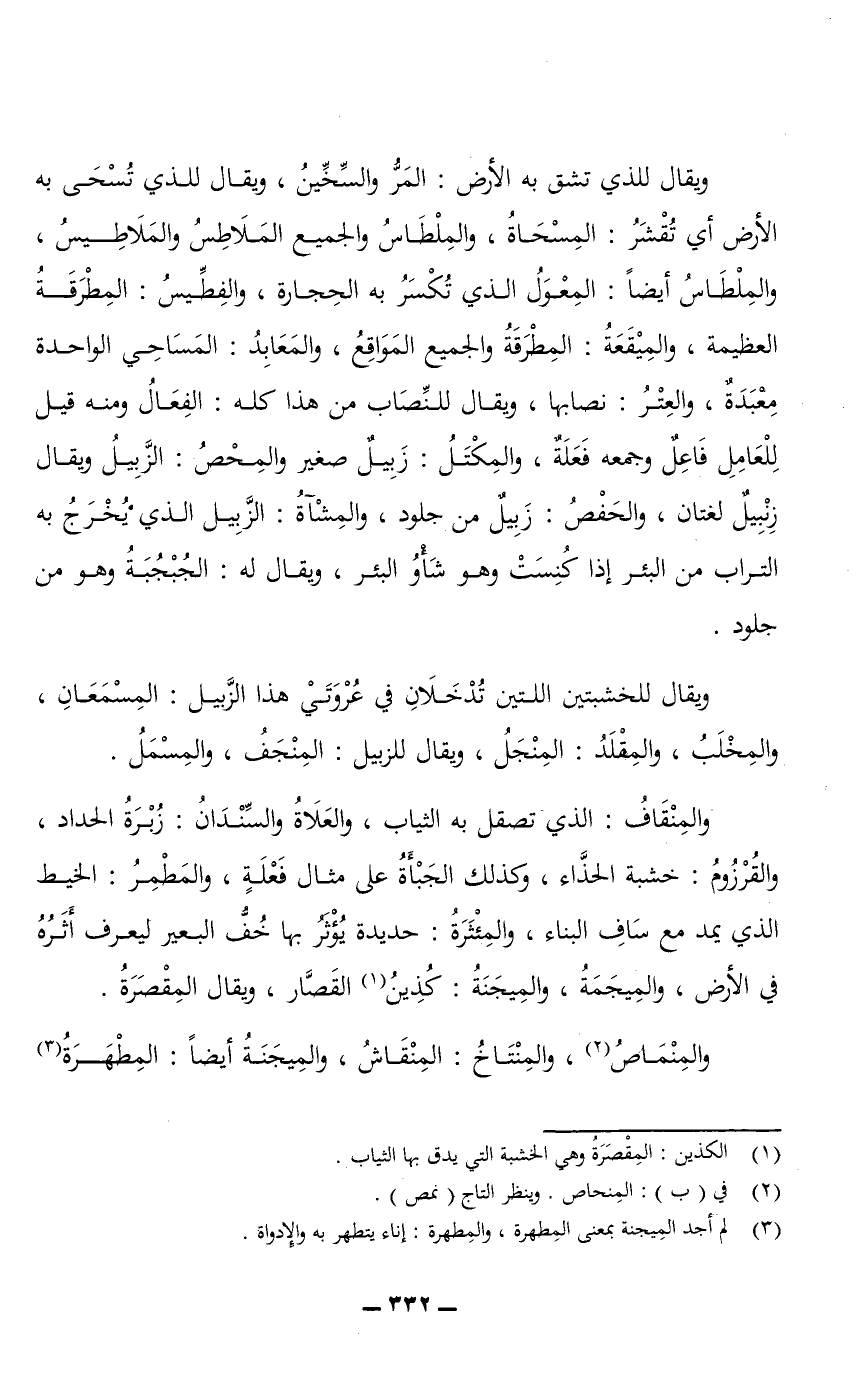 ويقال للذي تشق به الأرض: المَرُّ والسَّخِّينُ، ويقال للذي تُسْحَى به الأرض أي تُقْشَرُ: المِسْحَاةُ، والمِلْطَاسُ والجميع المَلاطِسُ والمَلاطِيسُ، والمِلْطَاسُ أيضًا: المِعْوَلُ الذي تُكْسَرُ به الحجارة، والفِطِّيسُ: المِطْرَقَةُ العظيمة، والمِيْقَعَةُ: المِطْرَقَةُ والجميع المَوَاقِعُ، والمَعَابِدُ: المَسَاحِي الواحدة مِعْبَدَةٌ، والعِتْرُ: نصابها، ويقال للنِّصَابِ من هذا كله: الفِعَالُ ومنه قيل للعامل فاعل وجمعه فَعَلَةٌ، والمِكْتَلُ: زَبِيلٌ صغير والمِحْصُ: الزَّبِيلُ ويقال زِنْبِيلٌ لغتان، والحَفْصُ: زَبِيلٌ من جلود، والمِشْآةُ: الزَّبِيلُ الذي يُخرج به التراب من البئر إذا كُنِسَتْ وهو شَاوُ البئر، ويقال له: الجُبْجُبَةُ وهو من جلود.