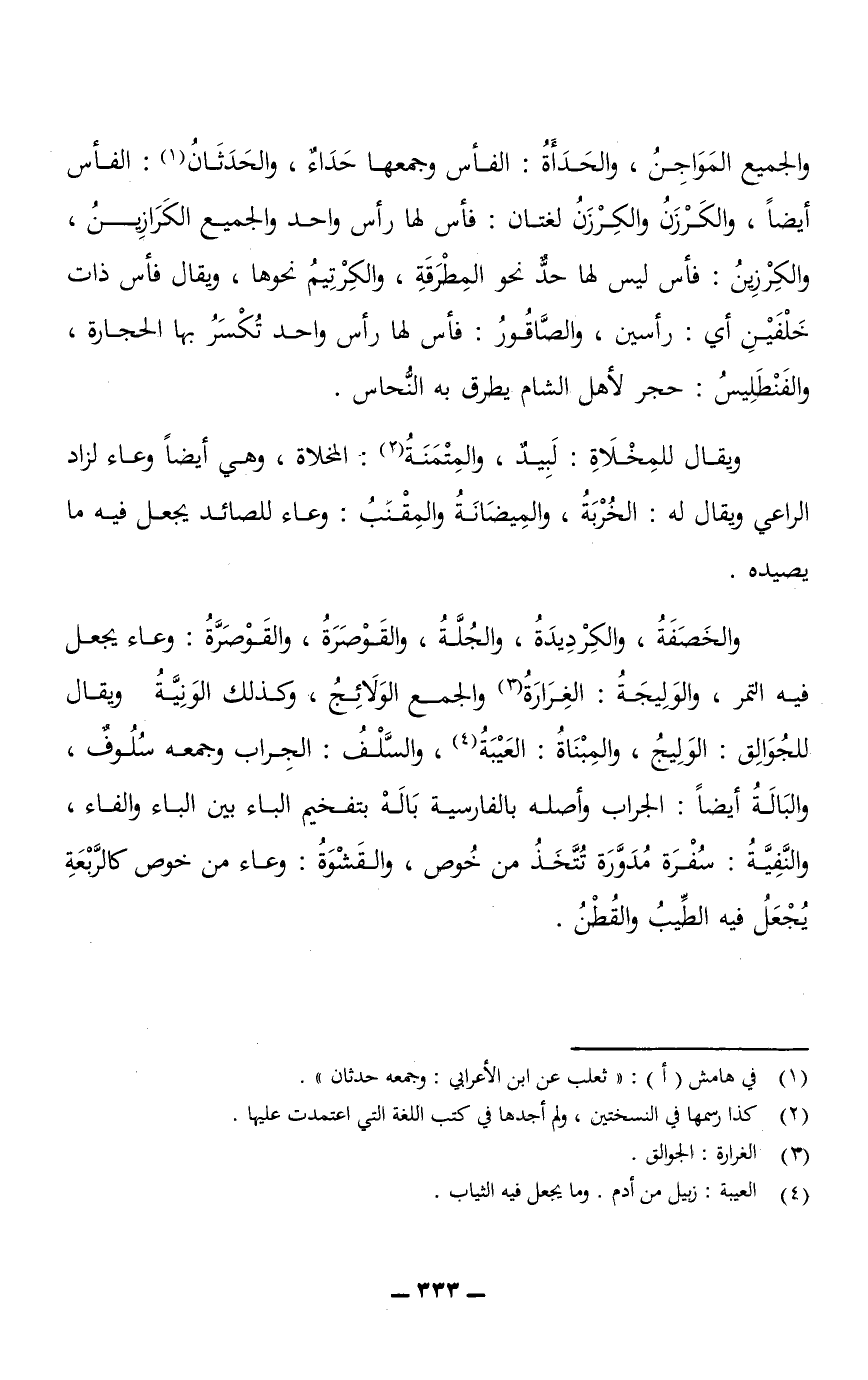 والخَصَفَةُ، والكِرْدِيدَةُ، والجُلَّةُ، والقَوْصَرَةُ، والقَوْصَرَّةُ: وعاء يجعل فيه التمر، والوَلِيجَةُ: الغِرَارَةُ والجمع الوَلائِجُ، وكذلك الوَنِيَّةُ ويقال للجُوَالِقِ: الوَلِيجُ، والمِبْنَاةُ: العَيْبَةُ، والسَّلْفُ: الجِراب وجمعه سُلُوفٌ، والبَالَةُ أيضًا: الجراب وأصله بالفارسية بَالَه بتفخيم الباء بين الباء والفاء، والنَّفِيَّةُ: سُفرة مُدوَّرة تُتَّخذ من خُوص، والقَشْوَةُ: وعاء من خوص كالرَّبْعَةِ يُجعل فيه الطِّيب والقُطن.