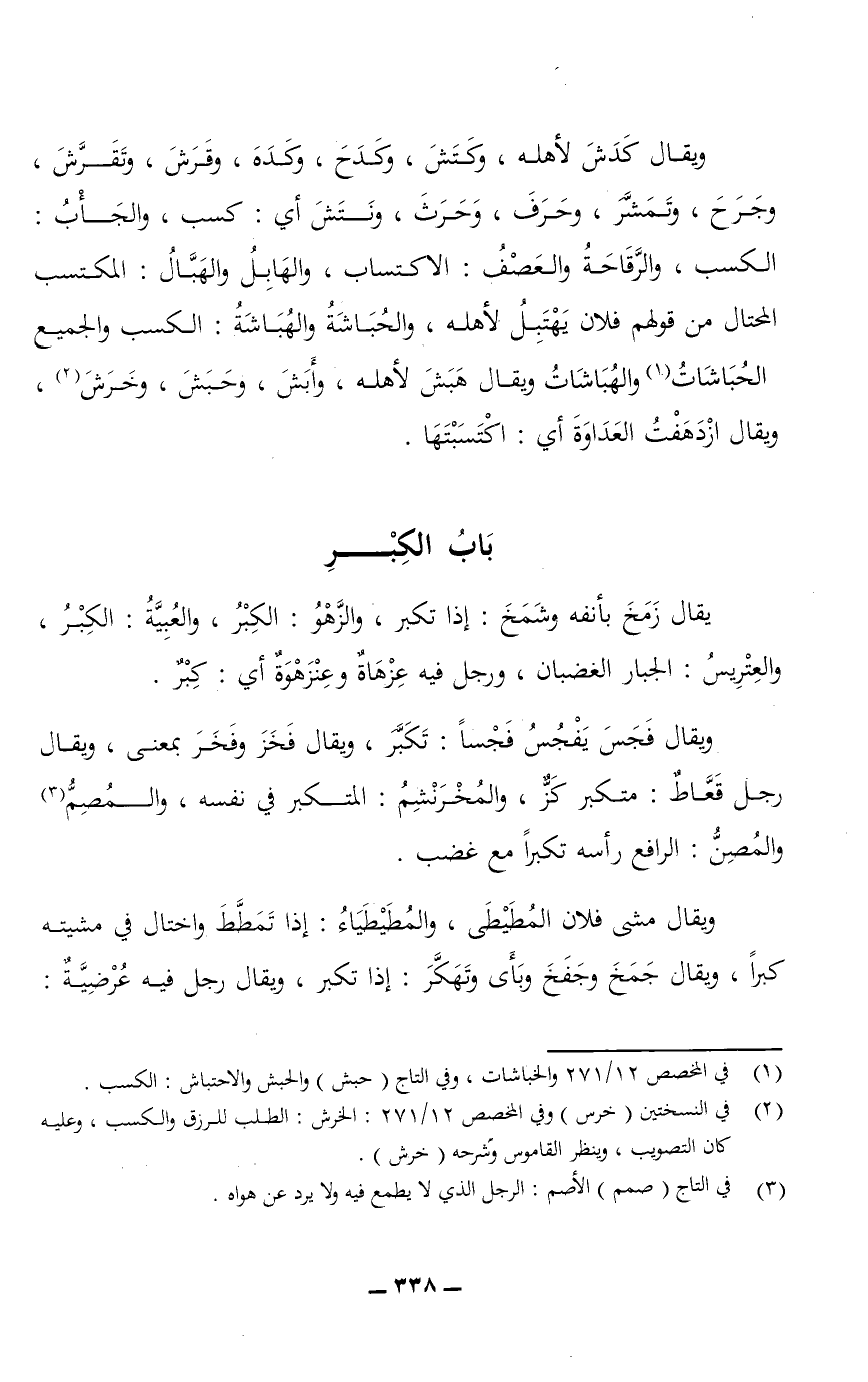 ويقال فَجَسَ يَفْجُسُ فَجْسًا: تكبر، ويقال فَخَزَ وفَخَرَ بمعنى، ويقال رجل قَعَّاطٌ: متكبر كَزٌّ، والمُخْرَنْشِمُ: المتكبر في نفسه، والمُصِمُّ والمُصِنُّ: الرافع رأسه تكبرًا مع غضبٍ.