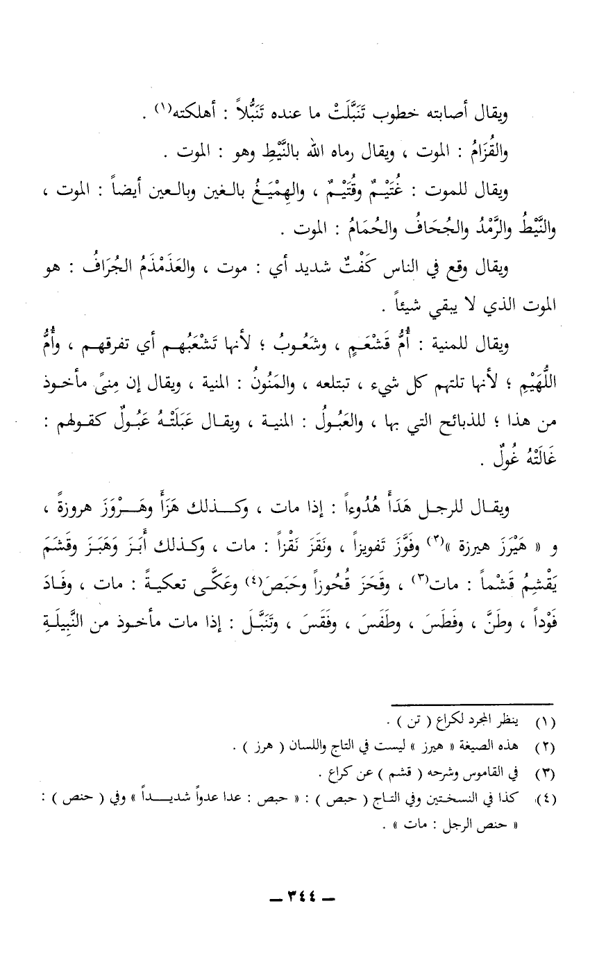 ويقال للرجل هَدَأَ هُدُوءًا: إذا مات، وكذلك هَزَأَ وهَرْوَزَ هَرْوَزَةً، وهَيْرَزَ هَيْرَزَةً وفَوَّزَ تَفْوِيزًا، ونَقَزَ نَقْزًا: مات، وكذلك أَبَزَ وهَبَزَ وقَشَمَ يَقْشِمُ قَشْمًا: مات، وقَحَزَ قُحُوزًا وحَبَصَ وعَكَّى تَعْكِيَةً: مات، وفَادَ فَوْدًا، وطَنَّ، وفَطَسَ، وطَفَسَ، وفَقَسَ، وتَنَبَّلَ: إذا مات مأخوذ من النَّبِيلَةِ