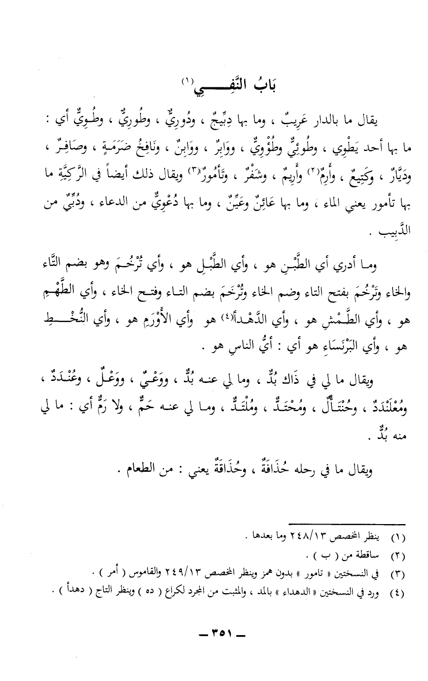 يقال ما بالدار عَرِيبُ، وما بها دِبِّيجٌ، ودُورِيٌّ، وطُورِيٌّ، وطُوِيٌّ أي: ما بها أحد يَطْوِي، وطُوئِيٌّ وطُؤْوِيٌّ، ووَابِرٌ، ووَابِنٌ، ونَافِخُ ضَرَمَةٍ، وصَافِرٌ، ودَيَّارٌ، وكَتِيعٌ، وأَرِمٌ، وأَرِيمٌ، وشَفْرٌ، وتَامُورٌ ويقال ذلك أيضًا في الرَّكِيَّةِ ما بها تَامُورٌ يعني الماء، وما بها عَائِنٌ وعَيِّنٌ، وما بها دُعْوِيٌّ من الدعاء، ودُبِّيٌّ من الدَّبِيبِ.