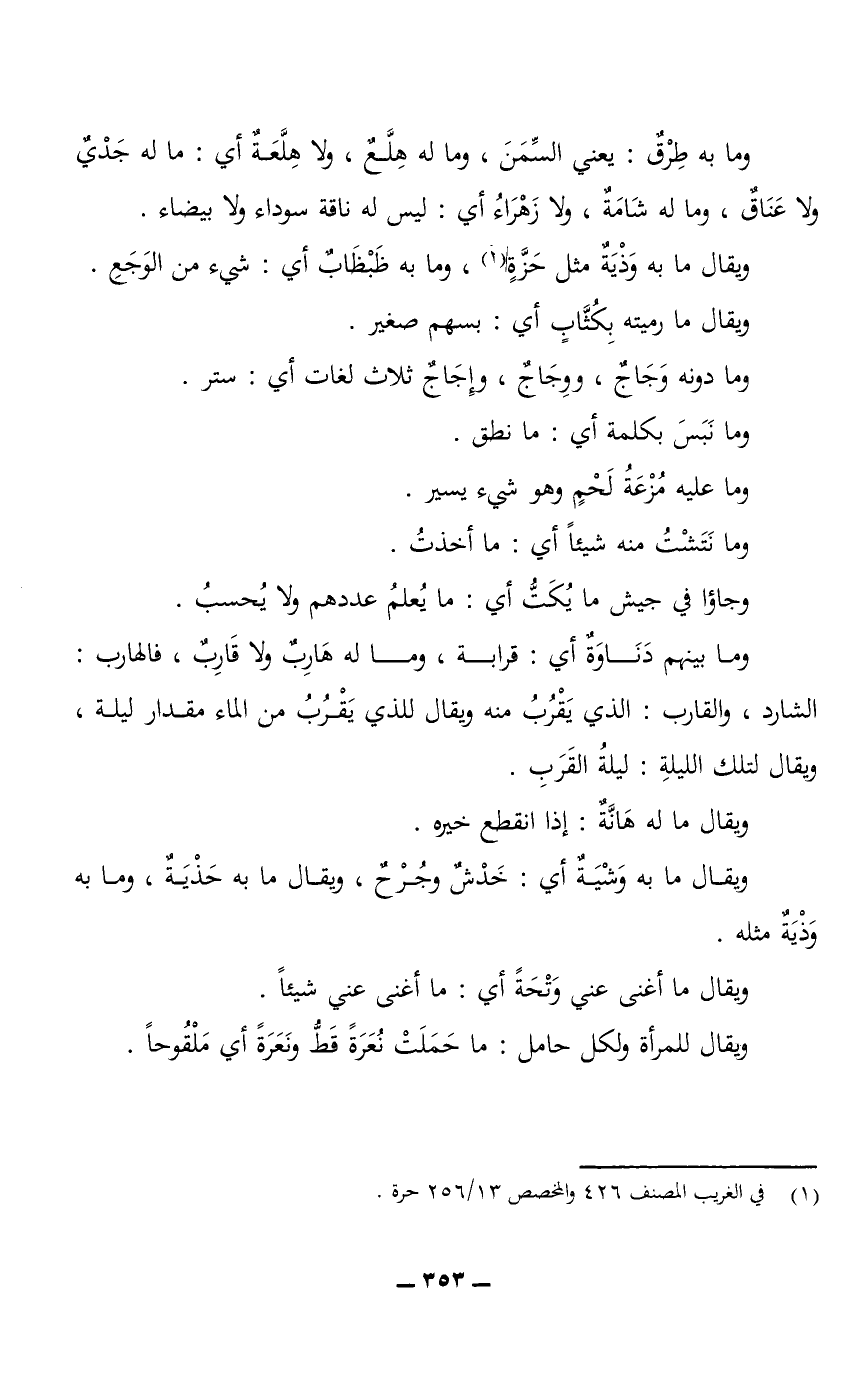وما به طِرْقٌ: يعني السِّمَنَ، وما له هِلَّعٌ، ولا هِلَّعَةٌ أي: ما له جَدْيٌ ولا عَنَاقٌ، وما له شَامَةٌ، ولا زَهْرَاءُ أي: ليس له ناقة سوداء ولا بيضاء.