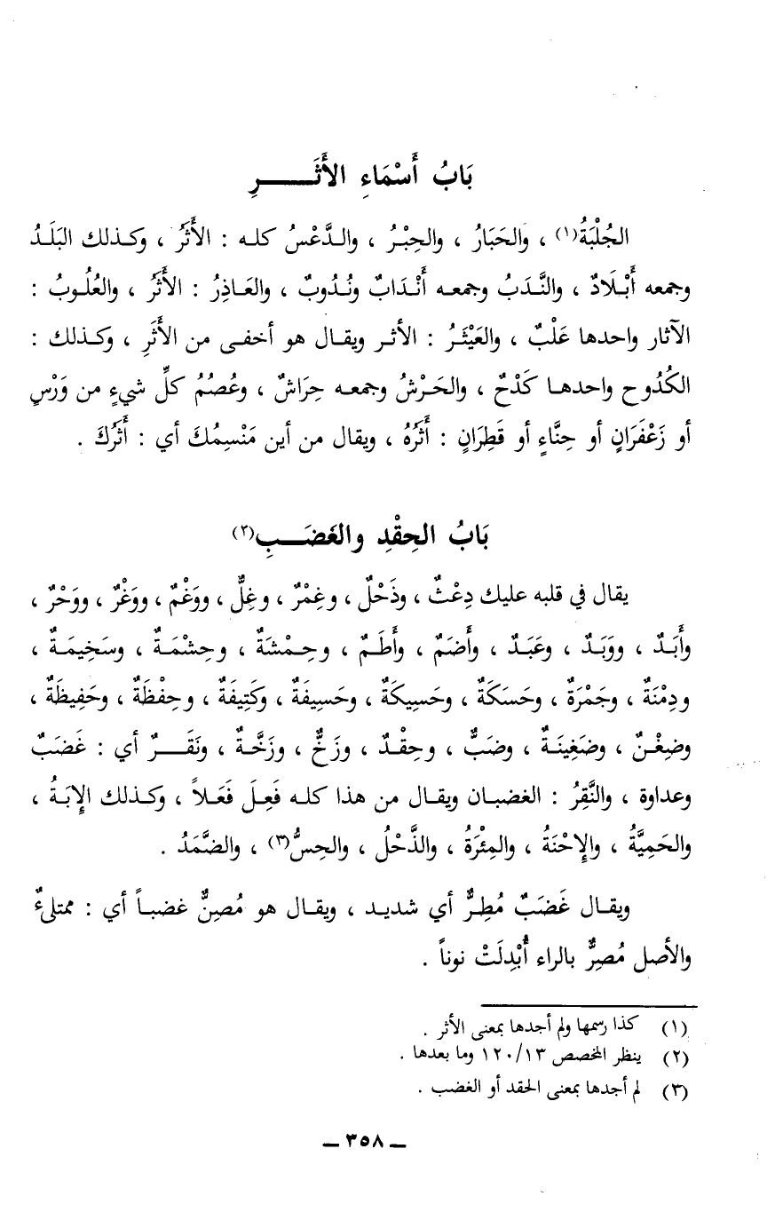 الجُلْبَةُ، والحَبَارُ، والحِبْرُ، والدَّعْسُ كله: الاُثر، وكذلك البَلَدُ وجمعه أَبْلادٌ، والنَّدَبُ وجمعه أَنْدَابٌ ونُدُوبٌ، والعَاذِرُ: الأَثَرُ، والعُلُوبُ: الآثار واحدها عَلْبٌ، والعَيْثَرُ: الأثر ويقال هو أخفى من الأَثَرِ، وكذلك: الكُدُوحُ واحدها كَدْحٌ، والحَرْشُ وجمعه حِرَاشٌ، وعُصُمُ كل شيء من وَرْسٍ أو زَعْفَرَانٍ أو حِنَّاءٍ أو قَطِرَانٍ: أَثَرُهُ، ويقال من أين مَنْسِمُكَ أي: أَثَرُكَ.