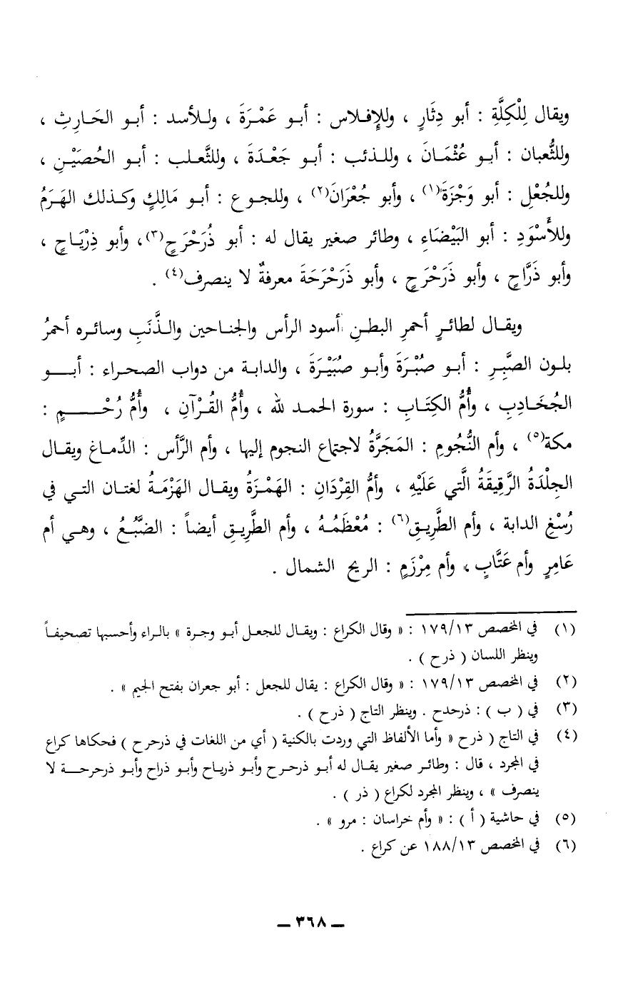 ويقال لِلْكِلَّةِ: أبو دِثَارٍ، وللإِفْلَاسِ: أبو عَمْرَةَ، وللأسد: أبو الحَارِثِ، وللثُّعْبَانِ: أبو عُثْمَانَ، وللذِّئْبِ: أبو جَعْدَةَ، وللثعلب: أبو الحُصَيْنِ، وللجُعْلِ: أبو وَجْزَةَ، وأبو جُعْرَانَ، وللجوع: أبو مَالِكٍ وكذلك الهَرَمُ وللأَسْوَدِ: أبو البَيْضَاءَ، وطائر صغير يقال له: أبو ذُرَحْرَحٍ، وأبو ذِرْيَاحٍ، وأبو ذَرَّاحٍ، وأبو ذَرَحْرَحٍ، وأبو ذَرَحْرَحَةٍ معرفةٌ لا ينصرف.