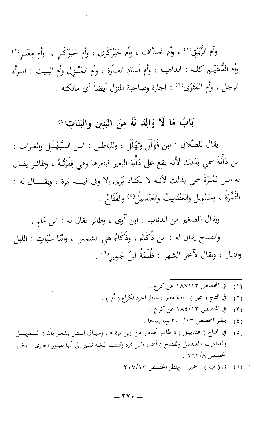 يقال للضَّلالِ: ابن فَهْلَلَ وثَهْلَلَ، وللباطل: ابن السَّبَهْلَلِ، والغراب: ابن دَايَةَ سُمي بذلك لأنه يقع على دَايَةِ البعير فينقرها وهي فِقْرَتُهُ، وطائر يقال له ابن تَمْرَةَ سُمي بذلك لأنه لا يكاد يُرَى إلا وفي فيه تمرة، ويقال له: التُّمَّرَةُ، وسَمْوِيلُ والعَنْدَلِيبُ والعَنْدَبِيلُ والفَتَّاحُ.